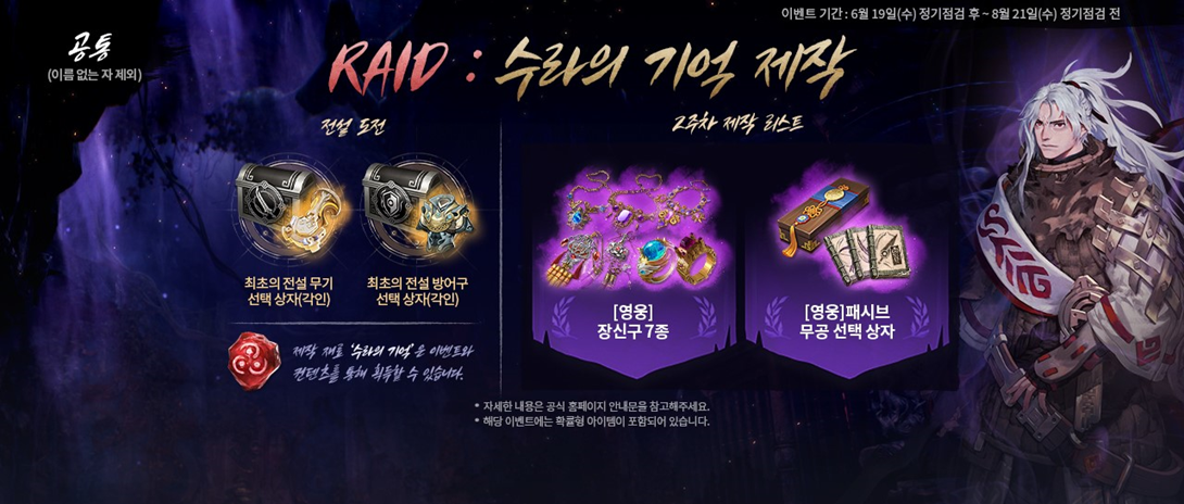 이벤트 기간동안 다양한 컨텐츠를 통해 ‘수라의 기억’ 을 획득하고, 시즌에만 제작할 수 있는 특별한 아이템을 제작해보세요!