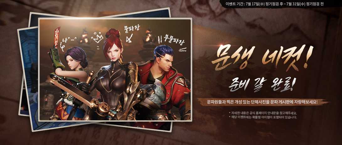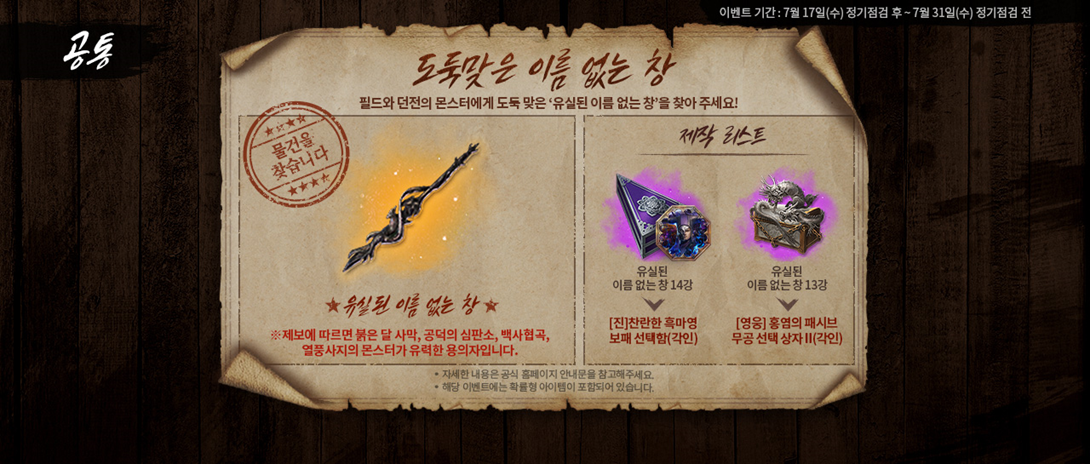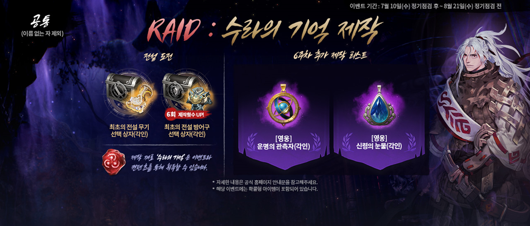 개선 및 수정사항■ 투기장 - 투쟁의 광장에서 중심핵 ‘노이/이름없는 자’가 보호막이 있는 상태에서 피해가 들어가던 현상을 수정하였습니다. ■ 협행 - 반달호수, 태록림, 비옥대지, 해룡산맥, 열풍사지의 희귀 및 영웅 협행, 백사협곡 희귀 협행에서 얻을 수 있는 신선루 파편의 확률이 하향되었습니다. - 백사협곡 영웅 협행에서 얻을 수 있는 신선루 파편의 개수가 증가하였습니다. ■ 기타 - 열풍사지 지역의 최후의 일격상자의 보상이 문파보관함으로 이동하지 않던 현상을 수정하였습니다. - ‘알록달록 비치볼’ 아이템 개봉 시, 영웅 소울 파편 선택 꾸러미가 1회만 획득되는 현상이 수정되었습니다. > 미지급된 아이템은 7/17(수) 정기점검 이후 순차적으로 우편으로 지급됩니다. 이벤트 & 프로모션정기점검 이후 업데이트 되는 이벤트 및 프로모션을 소개합니다. [이벤트] 도둑 맞은 이름 없는 창 [이벤트] 도치의 역습 : 문파에 찾아온 귀여운 손님 [이벤트] 문생네컷! 준비 갈 완료! [이벤트] RAID : 수라의 기억 6주차 새로운 이벤트 & 프로모션 모아보기