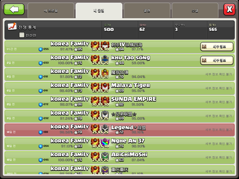 좀전에 끝난 500승 도전 클전에서 85:84 한점차로 역전승.. 기어이 500승 달성했습니다 클전을 좋아하고 열심히 같이 하실 분 . 매너좋고 소통 잘 하실 수 있는 분이면 누구라도 환영합니다 500승 달성 기념 클랜도 공개로 오픈해서 내일 밤까지 신입 받고 있습니다 많이 방문해주세요 단, 오버홀 유저, 파밍만 하실분은 사절입니다. 새로 오신분은 친선전으로 공격 하시는거 기본기만 살짝 봅니다. 신입분은 coc인벤 보고 왔다고 말씀해 주세요.. 내일 밤 이후는 다시 초대한정으로 변경 예정입니다. ![]() ![]()