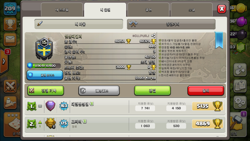 lv15 뒷방패밀리 유닛 무제한/클겜 항상 풀보상![]() ![]() 대문공지 지킬 자신있는분 가입 부탁 드려요 클전 클겜 활발 /지원 친선 활발 /지정유닛 가능 클전 공격 자율/단톡가입 자유 10홀 영웅합 60이상 11홀 영웅합 100이상 각홀에 알맞는 방타 선호 합니다