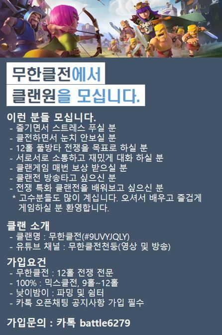 12홀 모집/유튜브동영상/이벤트 운영![]() 무한클전은? - 인게임 채팅 하루 5천개이상씩 채팅하면서 서로서로 즐거운 분위기를 만들어가는 클랜입니다. - 친선전을 통해 서로서로 피드백을 주고 받으며 실력도 갖춘 클랜입니다. - 생방송 이벤트/ 다양한 이벤트를 진행해서 활기차고 즐거운 게임문화를 만들어가는 곳입니다 - 운영진 모니터링으로 갑질은 용납하지 않으며 서로 격을 낮추고 친목을 우선으로 생각하는 곳입니다. -라벌유저 우대♡♡♡ *미친듯이 함께 노실분 무한클전으로 오세요♡♡♡
