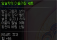 (추천도 ★★★☆☆) 암살셋입니다. 이것도 많이 좋다고들하시는데 크흠.. 어벤저악마화벤저용이라 글쎄요.. 일단 세트옵션입니다. 다받은상태에선 --------------------------------------------------------------- 힘 +55, 지능 +55, 체력 +55, 정신력 +55