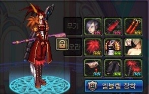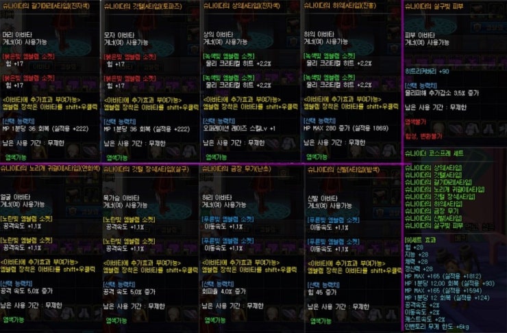 머리/모자 : MP회복 (힘) 얼굴/가슴 : 공속 (공속) 상의 : 오퍼레이션레이즈 (물크) 하의 : HP MAX (물크) 허리 : 회피율 (이속) 신발 : 힘 (이속) 피부(뚫X) : 물리피해감소