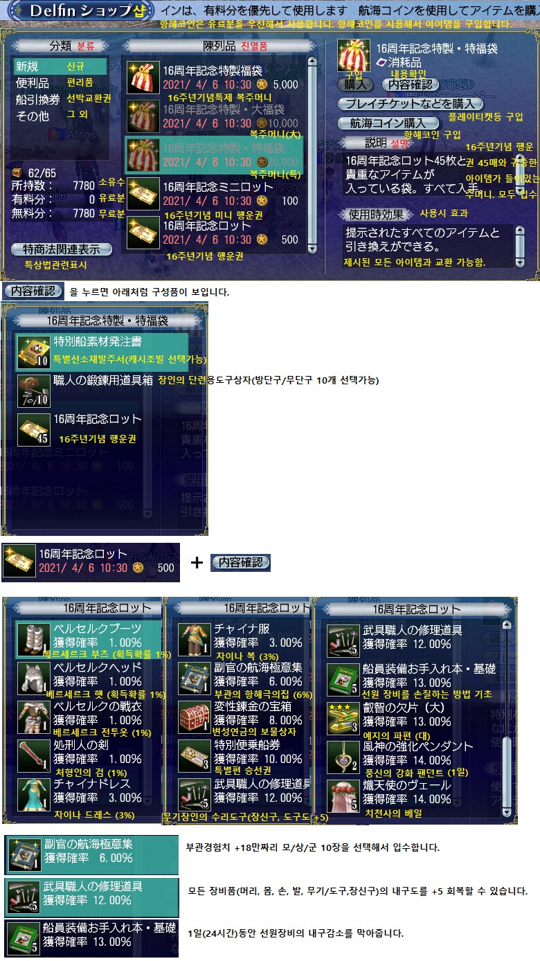 [일본서버] 16주년 신규가챠가 나왔습니다!안녕하세요. 일본 A서버 섬광의 뉴비(閃光のニュービー) & FlaSh 입니다. 오늘 점검이 끝남과 동시에 일본서버 16주년 기념 업데이트 및 이벤트가 실시되었습니다. 업데이트 소개(암흑정무관님) : http://www.inven.co.kr/board/dho/495/205517 신년가챠에 이어 간만에 새로운 16주년기념 가챠가 나와서 소개를 해드리고자 합니당~~~ 오늘 업데이트와 동시에 코인샵에 신규 가챠가 등록되었습니다. ![]() 일섭의 트박이라 볼 수 있는 가챠는 보통 신년, 주년, 골든위크, 써머, 할로윈, 성탄절 같은 축제날에 신규로 나와 판매되고 있습니다. 구입은 대략 이렇게 이루어지며 내용확인 및 확률확인도 인게임에서 할 수 있습니다. 미니 행운권 내용확인은 귀찮아서..빼먹었습니다. 아래 링크에서 확인부탁드리겠습니다. 이번 가챠 장비템의 스펙입니다. ![]() 베르세르크 세트+처형인의 검 착용샷~ ![]() 처형인의 검과 테삭의 전투장면. 테삭은 뭔가 조폭이 들고다니는 사시미칼같은 느낌.. ![]() 끝으로 차이나드레스입니다. 옥색은 이번에 나온거, 빨간색은 20년 신년가챠때 나온것입니다. 갠적인 취향은 빨간색.. ![]()