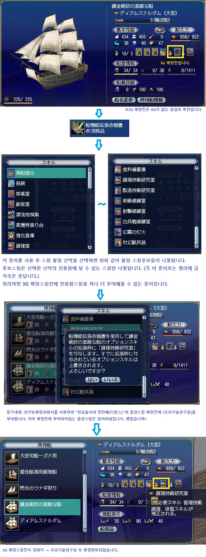 [일섭] 선기능확장의뢰서로 만든 궁극의 생산지원용 디암스안녕하세요. 일본 A서버 섬광의 뉴비(閃光のニュービー) & FlaSh 입니다. 어제 일섭에 21' 골든위크가챠가 오픈되면서 매우 흥미로운 새 소비품도 등장했습니다. 골든위크가챠 소개글 :http://www.inven.co.kr/board/dho/495/207187 바로 선기능확장의뢰서 라는 종이입니다. 오늘은 이 종이를 이용해서 구상만 했던 멋진 선박을 완성해볼까 합니다. ![]() 어제 가챠글에도 간략하게 소개드린 이 종이는 간단히 말씀드리면 전용함 옆에있는 3G확장칸(일섭은 6G가 없는 대신에 3G가 되면 스킬칸을 하나 더 줍니다. 일종의 스추개념입니다.)의 스킬을 바꿀 수 있는 종이입니다. 바꿀 수 있는 스킬후보는 그 선박에 달 수 있는 전용함스킬입니다. 한번 해보겠습니다. 선박은 연금술사용으로 건조한 디암스입니다. 연금술 부스팅을 위해 특수생산기술연구실을 승계했습니다. 연금술사용 선박 건조후기: http://www.inven.co.kr/board/dho/495/194436 ![]() 요렇게 사용 가능합니다. 즉 전용함스킬을 2개 달 수 있게됩니다. 이참에 전용함도 증기기관에서 제조기술연구실로 바꿔주었습니다. ![]() 연금술, 언어학, 조리, 보관, 봉제, 공예, 주조.. 조선을 제외한 모든 생산스킬에 1,2,4발품목까지 +1해주는 궁극의 생산지원용 디암스가 완성되었습니다! 3발창고+1을 붙일수 없는건 아쉽지만..ㅇ_ㅇ 마지막으로, 확장의뢰서 종이로 붙인 스킬은 승계가 되지 않습니다. ![]() 위 스샷처럼 스킬계승 후보에 [조리기술연구실]이 뜨지 않습니다. 최근에 신규선박 건조에 매너리즘이 와서 흥미가 살짝 떨어진 상태였습니다. 그러나 이 종이로 인해 무슨 배에 어떤 스킬구성을 해줄지 고민이 되면서 흥미를 되찾았습니다. 환수용 선박에 급가승계+2환수스킬도 가능할 거 같고.. 급가승계+대환수대책실+배펌(전용함) 도 가능할 거 같고.. 갑자기 배 만들 의욕이 마구마구 샘솟는군요 ㅋ_ㅋ