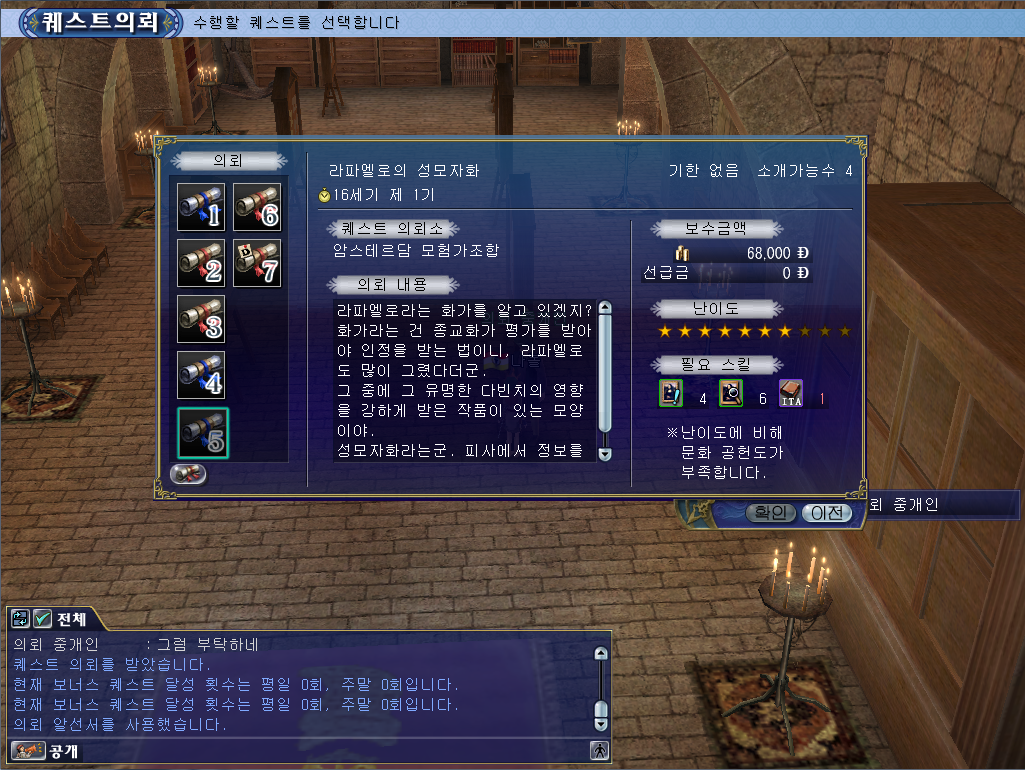 퀘스트하시다가 높은 랭크의 레어 퀘스트를 해야할 순간이 오면 짜증나죠..알선서도 계속 뜯어먹고..퀘스트 하나하나 클릭하면서 확인하느라 손도 아프고.. 이럴 때 잘 나오는 퀘스트를 먼저 하나 받으면 이후로는 그 퀘스트가 안나오므로 원하는 퀘스트가 나올 확률이 조금 더 높아집니다! 그리고 문화 공헌도를 이용해 손을 조금 덜 아프게 하는 방법이 있습니다. 이 방법은 자신이 띄우려는 퀘스트의 랭크가 문화 공헌 레벨보다 높아야 합니다! 예를 들면 제 문화 공헌도 레벨은 4이므로, 8성짜리 '대왕의 일화' 퀘스트를 띄울 때 이 방법을 쓸 수 있습니다. 먼저 퀘스트 하나를 받은 후에 알선서를 돌리게 되면, 아래 사진과 같이 자신의 문화 공헌도 레벨보다 높은 난이도의 퀘스트는 어둡게 표시됩니다. 문화 공헌도로 받을 수 없는 퀘스트라는 뜻이지요. 이걸로 퀘스트 7개를 일일히 눌러보지 않고 어두운 색의 퀘스트만 확인하면서 쓸모없는 클릭을 줄일 수 있습니다. 예를 들어 스크린샷을 보면, 어둡게 표시된 5번 퀘스트만 확인하고 넘어가도 됩니다. (다른 퀘스트는 내 문화 공헌도의 레벨보다 낮은 난이도이기 때문에 내가 원하는 퀘스트일리가 절대 없습니다.) ![]() 알선서 100장을 써도 안 나오는 퀘스트를 띄우기 위해 땀나는 손을 조금이라도 편하게 하기 위해서 쓴 팁이였습니다..! (사실 귀차니즘이 너무 강해서..)