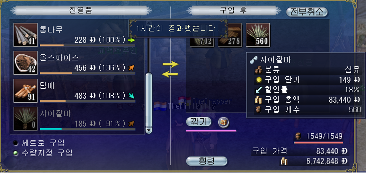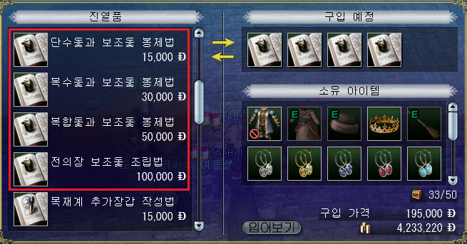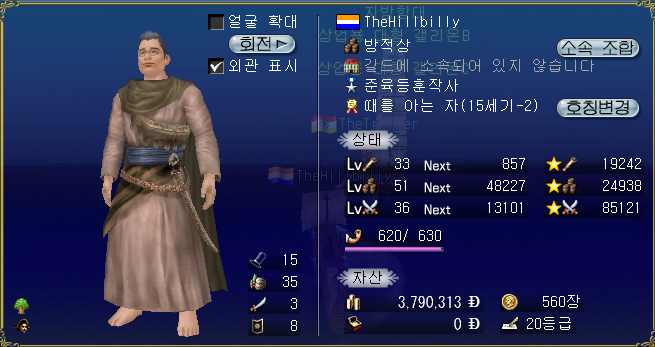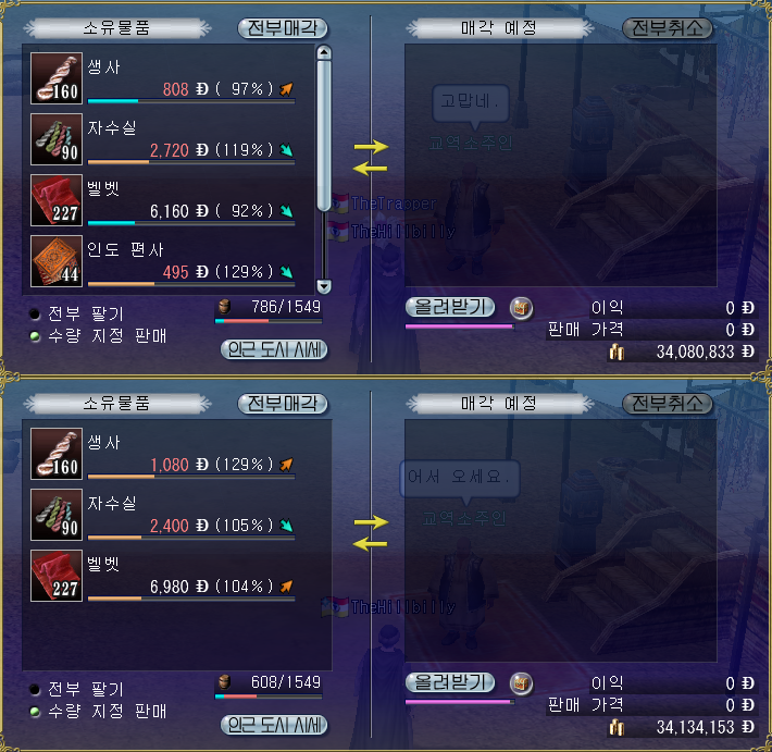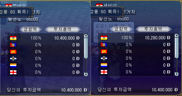 맨땅 헤딩, 투클로 시작한 육성일지 (6)이번 편은 [18] 동아시아 입항 [19] 봉제 (벨벳, 강돛 메모리얼, 조빌돛 제작) [20] 선박강화 (야무사, 클레르몽) 입니다. 이어서 갑니다. ![]() 중간점검. 본캐 34/40/40, 부캐 33/50/36 군렙 차이가 있으니 멘토를 꼭 맺고 보고해주세요. 멘토 활용은 렙이 1이라도 높되, 멘토 받는 캐릭이 해당계열 40 이하일 때만 가능합니다. 다시 말해, 부캐 군렙 40을 넘으면 멘토로 해역토벌 경험치 뻥튀기는 불가능합니다. (멘토용 부캐를 데려오지 않는 이상) 할 수 있을때 최대한 활용합시다. [18] 동아시아 본캐 군렙을 40까지 올리셨다면 인도를 떠나 동남아시아의 마닐라로 갑니다. 가는 길에 벵갈만 동쪽의 페구에 들러 25만을 투자하여 교역소에서 [별갑]을 띄워줍니다. ![]() 그러면 자카르타에서 상인퀘 [보석으로 불리는 등껍질]을 띄울 수 있습니다. (https://www.ssjoy.org/dho/quest/17131) 유럽 복귀하실 때 4발도 챙길겸 수행하도록 합시다. 별갑을 적당량 사서 아파트에 보관해놓으면 편리하겠네요. 프랑스분들이라면 마음에 드는 향기(https://www.ssjoy.org/dho/quest/18049)도 좋습니다. 이건 따로 선행조건은 없습니다. ※ 마닐라 가기 전에 먼저 받아두셔도 됩니다. 칙명퀘와 일반퀘는 따로 취급되거든요. 마닐라에 도착하면 에스파니아 집정관에게 칙명퀘를 받습니다. 향료 제도 이북의 정보 수집 (https://www.ssjoy.org/dho/quest/18276) 등 쉬운 퀘스트를 수행합시다. ![]() 세비야의 타베라 후작에게 가서 동아시아 입항허가를 받습니다. 동아시아 입항허가를 받으면 부관 고용수가 1 늘어나니 고용하여 스킬과 캡틴 가방을 늘립시다. 이로써 칙명을 통한 입항허가는 모두 획득했습니다. 다음 목적지는 동아시아의 화남 지역(중국)입니다. 출발 전, 준비물을 몇 가지 구매할게요. 추가 스프릿 1개(조선소 무기장인), 목공도구 10개, 오물방지 도장 1개, 전용함 건조허가증 3장(장당 4~5천만) (저는 전용함 사느라 오방과 급가제물 팔아 번 돈 다 털렸습니다.) 여지껏 제가 렙업 목표를 정해뒀던 이유는 포술가를 제외하면 모두 새 배를 타기 위해서였습니다. 군렙 40을 목표로 정한 것도 앞으로 이동용 배로 타고 다닐 [야전식 무장사선]에 탑승하기 위해서였죠. 여기서 잠깐 제가 이동용 배를 선정한 과정을 알려드리자면, ① 순항형 경 클리퍼 - 원래 이걸 타려고 했으나 선체 조달이 어려워서 포기했습니다. ② 적다 상롱스 - 상렙 올리기까지 긴 시간을 노강 졸기삼으로 다닐 수 없어서 패스. ③ 기타 저렴이 캐쉬선(축조하 등) - 구할 수 있다면 강화해서 타고 다니셔도 됩니다. 하지만 모두가 구할 수 있는 정도는 아니라고 판단되어 패스. ④ 사선 - 쉽게 구할 수 있고, 돛수치도 준수하고, 티크 0G 기준 야무사와 거의 비슷한 돛 수치지만 (야무사 436/237, 사선 425/257) 초반 가속이 빠른 야무사 당첨. 하여, 최종적으로 타고 다닐 배에 대한 계획은 ① 근거리 - 야무사 ② 장거리 - 조빌 롱스쿠너 ③ 무역용 - 개윈잼 ④ 수탈용 - 조빌 솔레이유 로얄 이정도가 되겠습니다. 물론 더 좋은 배를 구하시면 그걸 타고 다니시면 됩니다. 어쨌든 화남의 마카오에 갑시다. ![]() 아쉽게도 카지노는 구현이 안 되어있습니다. ![]() 조선소 주인에게 야무사를 삼나무 재질로 건조합니다. ![]() 그 후, 건조한 야무사에 전용함 스킬로 급가속을 달아주세요. 급가속이 달리면 그대로 타 봅시다. (전에 구해둔 브릴리언트 햇 쓰세요. 항기 8랭 되면 빼셔도 됩니다.) 첨으로 10노트를 넘기니 눈물이 나네요. (사실 그전까지 졸기삼으로는 속도 확인도 안함) 조금이나마 빨라진 배에 만족감을 느끼며 유럽으로 돌아갑니다. 저는 교역품 안 싣고가서 항상 수에즈 운하 탔습니다. ![]() 틈틈이 런던 들러서 이벤트하고 새 연구 받는 것도 잊지 마세요! [19] 봉제 야무사를 강화하려면 돈이 많이 드니 다른 돈벌이도 알아보고자 합니다. 봉제를 올리러 가기 전에 레시피 몇 가지를 준비합시다. ※ 경숙이 이벤트 중이라면 2캐릭 모두 봉제 올려주시면 좋습니다. 혹은 강돛 2개 먹겠다 하시는 분도 2캐릭 진행해주세요. 1) 봉제 올리기 ① 레시피 구매 모드 디자인집 1권, 직물 비법서-옷감에 관한 책 - 본거지 옆 도시 아무 도구점 (도버, 헤르데르, 포르투, 말라가 등등) 직물 비법서-고급 옷감에 관한 책 - 본거지 도구점 ② 부스터 준비 - 비취 목걸이 6국 본거지 + 이스탄불 여급에게 일정 이상 친밀도를 쌓고 술 한 잔 마시면 선물을 줍니다. ![]() ![]() XXXX의 선물 이런식의 아이템 상자를 주는데, 여기서 랜덤하게 [비취 목걸이]가 나옵니다. ![]() 직물 거래 +2, 봉제 +1의 매우 좋은 무한부스터예요. 저는 세비야 주점 여급 로잘리오에게 숏소드 3갠가 주고 받아냈습니다. 10월 12일에 여급 투어 돌면서 느낀건데, 뭘 주든 1, 2개씩 깔짝주면 보상을 안 줍니다. 숏소드 정도 도구점 아이템을 3개 연속으로 줘보세요. 그러고 나서 술마시면 바로 보상 줄겁니다. ③ 리스본 갠상에서 대나무 빗자루(봉제 +1)까지 구매하시면 좋습니다. 준비하셨으면 방적상으로 전직하시고, 섬유거래, 직물거래, 봉제를 배운 뒤 북유럽의 오슬로로 갑시다. 가기 전에 조합 마스터에게 공작산업 지원협회 가입하시면 좋