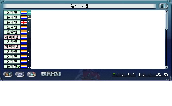 2012년 11월 3일에 만들어 11월 25일에 nis연합에 합류 지금까지 쭉 이어오고잇습니다 현재길드원은 47명으로 주말평균접속인원이 약 15명정도됩니다 ![]() 그외 연합되어잇는길드가많아서 대화방을 2개를 오픈해도 모자랄정도로 시끌벅적한 길드입니다 또 모험가 길드답게 다같이 유적탐험,침몰선캐기,레이스 등등 서로모여 웃고떠들만한 이벤트를 구성하고잇습니다 그외 초보모험가분들을 위해 상렙지원,길드선박지급등등 지원에대해 심혈을 기울이고잇으며 모험에 필요하신 부스터도 대여해드리고잇습니다(부스터가 몇개없는게..) 천천히 모험하면서 대화방에서 웃고떠들고싶으신분들 August로 오세요 가입문의:봉지,인랑,배네치아로가자