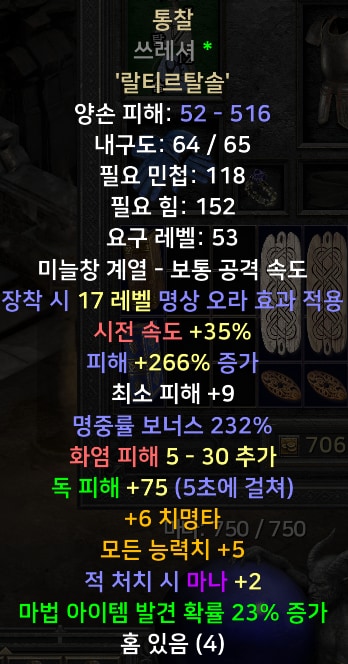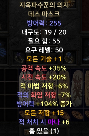 무기 : 통찰력 (35%) 벨트 : 유니크스파이더웹 섀시(20%) 악세서리 : 쌍패캐링(20%), 아뮬렛(20%) 헬멧 : 지옥파수꾼(20%)