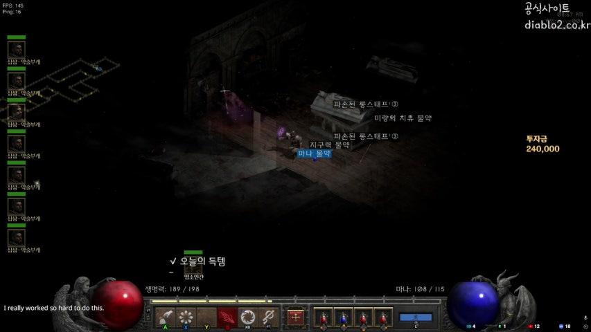 [빌드] 혁명적인 2프레임 웨어베어 어쌔신. 곰클씬팁게로 이전합니다. 업데이트 된 정보와 피드백은 여기에서. 2프레임 웨어베어 어쌔신 - 곰클씬 *중간에 평어체가 나오는데 양해 바랍니다. #빌드 소개와 시범 영상 https://youtu.be/pcz3DKpYJRA #Intro 레저렉션의 공속제한 해제로 주목해야 할 빌드가 있습니다. 바로 룬워드 야수의 곰 변신(werebear)을 이용한 빌드입니다. 레거시에는 소서리스의 원소데미지 증폭을 이용한 드림베어가 그나마 쓸만한 수준이었고 타 클래쓰는 그저 예능으로 치부될 정도였죠. 웨어베어의 스킬은 그저 평타밖에 없습니다. 베어폼 평타 공속은 레거시 때 3프레임이 한계였으나 레저렉션에서 2프레임이 가능합니다. 2프레임은 어쌔신과 팔라딘만이 가능한데, 이 두 클래스는 실효공속을 올리는 버스트나 파나티시즘 스킬을 보유하고 있기 때문이죠. 그 수혜를 200% 활용 할 수 있는 레저렉션용 빌드가 바로 곰클씬이라고 할 수 있습니다. #다른 빌드와 차별성 - 디아블로 역사상 최고의 타격감 2프레임 기본 공격의 타격감은 정해진 루프가 끝날 때까지 기다려야하는 롤백 스킬(드탈, 질, 스트레이프 등)들과는 비교도 안됩니다. 혁명적이라고 표현 하고 싶네요. - 편의성 베어폼의 기본공격은 오른쪽 버튼에 두고 누르기만 하면 이동과 자동공격이 동시에 됩니다. 기본 공격이기에 마나가 필요하지도 않습니다. '원-프레스'로 모든 컨트롤이 끝납니다. 콘솔용 특화 빌드로 해도 좋겠네요. #3프레임도 충분하지 않을까? ->영상의 5분 40초에 우버디아 테스트 참조 2프레임: 초당 12.5회, 공격 당 0.08초 3프레임: 초당 8.33회, 공격 당 0.12초 단순히 공격속도가 1.5배 올라가는 의미도 있지만 딜레이 관점으로 보면 두 배의 차이입니다. 예로 마리당 각 10회의 공격으로 100마리 몹을 잡을 때 누적 딜레이는 2프레임 일 때 1*10*100프레임(1000*0.04=40초) 3프레임 일 때 2*10*100프레임(2000*0.04=80초)가 됩니다. 여기에 방어 상의 이득까지 더해야 합니다. 적을 빨리, 많이 때린다는 것은 간접적으로 피격을 받을 확률을 감소시키는 효과가 있습니다. 적은 패힛과 블럭이 발동될 것이고 반대로 나는 덜 발동될 것입니다. 사냥 효율이 급격히 증가하죠. 더구나 베어폼의 블럭 프레임은 엄청난 페널티가 있습니다. 후에 빌드에서 다루겠습니다. #어쌔신이 베어폼에 절대적으로 유리한 이유 팔라딘 또한 2프레임이 가능하지만 6소켓 페블에 파낙이 강제되므로 실용성이 거의 없습니다. 또, 팔라딘의 베어폼이 절대로 주류 빌드가 될 수 없는 결정적 이유는 바로 편의성 입니다. 오라를 발동하는 동안에 우클릭 자동공격이 안되기 때문에 일일이 타게팅을 해줘야 합니다. 페이커 손가락이라도 못 버티겠죠. 변신폼 공속 계산식은 다음과 같습니다. FPA = {256 * 12 / [AnimationSpeed * Acceleration / 100]} - 1; Acceleration = 100 + SIAS + EIASprim - WSMprim; AnimationSpeed = [256 * formFrame / [256 * wpFrame / [(100 + IASprimWP - IAS - WSM) * AniSpeed / 100] ] ]; if wp==claw AniSpeed = 208 else AniSpeed = 256 wpFrame : (claw = 11) formFrame : (wereBear = 10) {}: 소수점 올림 []: 소수점 내림 ***유의할 점은 보통 스킬들 처럼 무기 공속과 아이템 공속을 합산하여 ias를 구하면 안됩니다. '무기 옵션에 있는 공속' + '무기 소켓으로 추가된 공속'이 IASprimWP이 됩니다. IAS는 무기 이외의 아이템 공속의 합입니다. 계산식대로 버스트와 클러 무기의 잇점이 그대로 반영됩니다. 페이즈블레이드가 가장 빠른 원핸드 무기로 알고 있는 분들이 많은데, 아닙니다. 어쌔신의 루닉탈런류가 가장 빠른 공속의 무기 입니다. 이 점은 베어폼의 기본공격에 그대로 적용 됩니다. 곰씬에게 엄청난 어드벤티지죠. 어쌔신의 클러류는 일반 원핸드 무기보다 공속 가속 수치가 빨라 2프레임 빌드가 아주 쉽습니다. 또, 어쌔신의 버스트는 최대 55실효공속을 올릴 수 있어서 파나시티즘과 비교가 안됩니다. 더구나 신뢰 파낙 용병까지 쓴다면? #룬워드 야수를 이용한 웨어베어(WereBear) 특징 -야수에 곰변신은 3레벨 스킬이지만 올스킬의 영향을 받는다. 체력/데미지/방어 증가 -야수로 변신 후 무기를 교체해도 폼은 유지된다. -변신 전에 쓴 버프는 유지 가능. 후에는 기본공격 외 다른 액티브 스킬을 쓸 수 없다. 팔라딘 오라는 컨트롤 가능. -베어폼의 공속은 무기공속과 종류에 크게 좌우되고 스킬/아이템 공속의 영향을 받는다. (무기공속(WIAS)이란 무기의 옵션과 소켓으로 획득하는 공속의 합) -쌍수 무기(바바리안, 어쌔신) 장착 시 공격이 불가능하다. -최대 공속은 2프레임(초당 12.5회 공격)이고 팔라딘과 어쌔신만 가능. -타 클래스는 페블이 최고 속도 무기지만 어쌔신은 루닉탈런 류를 쓰면 더 빠른 공속이 가능하다. -패힛 프레임