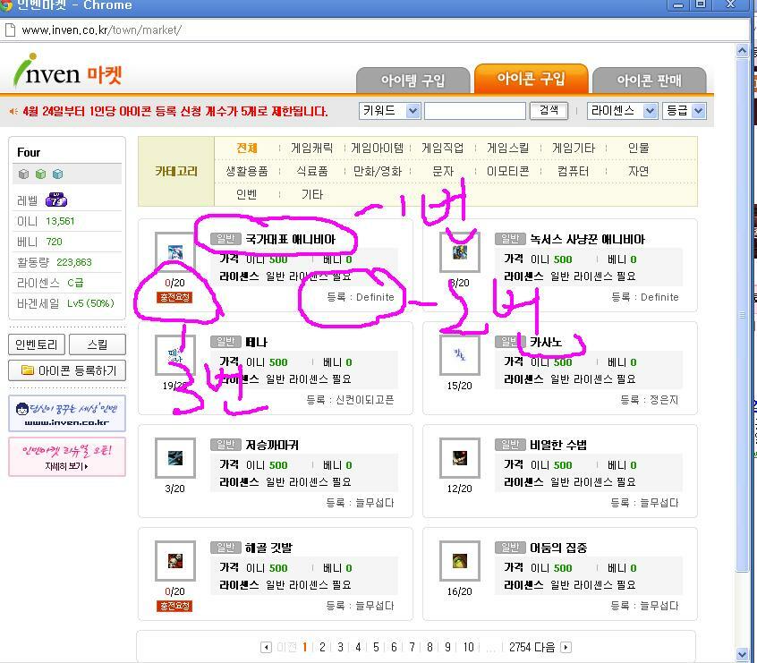 방법은 댓글로 가지고 싶은 아이콘 이름과 그 아이콘을 등록한 사람 이름을 써주세요 인벤마켓 들어가면 아이콘 볼수 있어요 신청 예) 국가대표 애니비아/Definite 이런식으로 댓글로 적어주시면 되요 단 제가 그림에 표시한 3번처럼 수량이 0/20 이런식으로 표시된건 선물로 드릴 수가 없어요 ![]() |