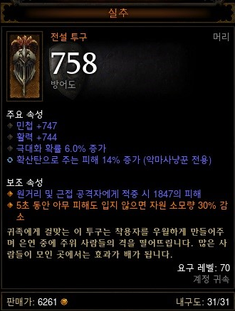 이게 바로 실추! 입니다! 옵션을 보시면 5초동안 아무 피해도 입지 않으면 자원 소모량 30%감소! 이게 무슨말이냐! 그냥 5초동안 다른몹한테 맞지 않으면 내가 스킬을쏠때 없어지는 마나가 30% 덜 없어진다는 거에요 ㅎ 참 쉽죠? 이건 예전에 확산악사라는 악사의 스킬트리가있었는데 주로 확산악사가 썻구요. 지금은 이 실추런 하시는분이 없으시더라구요..저도 별로 할 생각은 없구요..4막돌다가 나오면 써볼의향은 있어요! 가..가꼬시퍼.. ㅠ,. ㅠ 이런 템들이 4막에서는 다 나온다는겁니다! 무조건 나오는게 아니구요 ㅠ,. ㅠ 저한테 왜 안나오냐고 하지마세요! 그냥 4막에서는 왕실반지,숭배장갑,환영장화,실추 이 모든템이 나온다는 거에용~ ㅎㅎ 그리고 가장 중요한 아이템인!