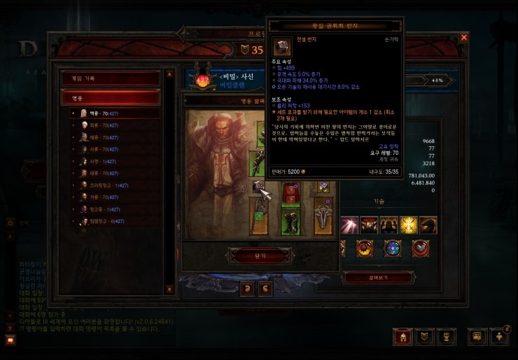 이게 바로 왕실권위의 반지구요. 모든캐릭터의 한쪽반지는 무조건 왕실반지라고 보시면됩니다. 저 옵션이 (세트효과를 받기 위해 필요한 아이템의 개수 1 감소(최소 2개 필요) 이렇게 나와있잖아요~ 이게 디아블로에선 모든캐릭터의 최종트리는 세트아이템을 착용하는겁니다. 만약에 세트아이템이 6개라고 하면 5개만 입으면 되는겁니다. 5개만입으면 6셋효과를 볼수가있구요. 저기서 또 다른세트아이템 2개를 또 입으면 3셋효과를 보실수가있는거죠. 대표적으로 성전사가 이렇게 입습니다 ㅎㅎ 성전사를 비롯해 운수(수도사) 비취부두(부두술사)등 왕실반지는 무조건 착용해야됩니다. 옵션이 않좋다고 너무 실망하진마세요. 저도 첨엔 진짜 않좋은거 착용하다가 열심히 해서 그나마 저정도 먹었습니다 ㅠ,.ㅠ 여러분은 더 좋으신거 드실수있으실꺼에요. 일단 모든캐릭터가 왕실반지를 착용해야되는건 확실하구요! 2셋효과만 받는 아이템은 1개만착용해도 2셋효과는 적용이 안됩니다! 무조건 2개이상 착용하셔야지 3셋효과를 볼수있습니다! 그럼 2셋 효과만 있는템이 뭐가있을까요..? 대표적으로 악마사냥꾼전용무기인 다네타세트가 있습니다. 스샷 보시죠!