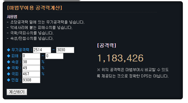 http://www.inven.co.kr/board/powerbbs.php?come_idx=2740&l=729190 나의 기본상태 ![]() [극피 1당 민첩수치 확인해 보기] ![]() ![]() [속피 1당 민첩수치 알아보기] ![]() ![]() 즐겜~ [추가 - 무기마부용 계산기] ![]()