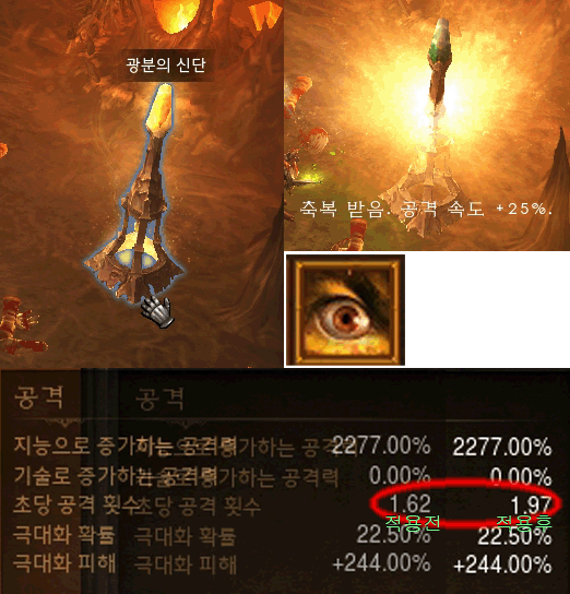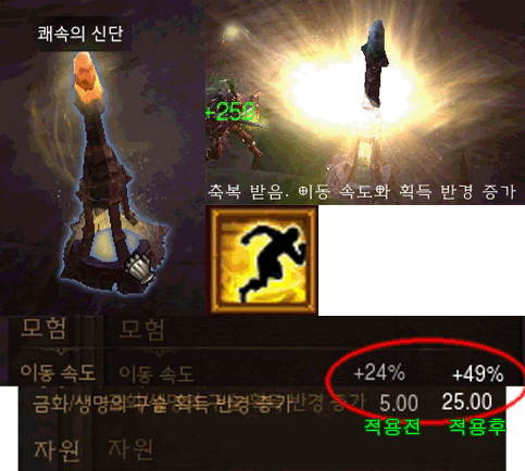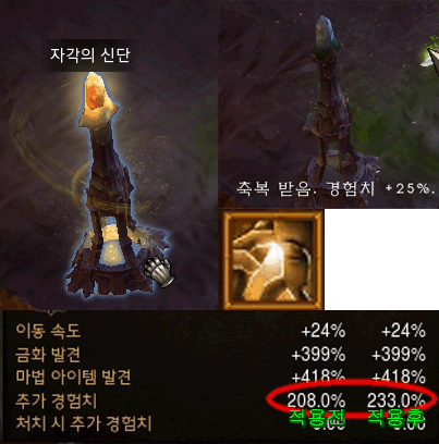 일시적으로 강화해주는 버프를 주는 장치로서 필드 여기저기에 널려 있습니다. 디아 3에 나오는 신단에 대해 알아봅시다! 일반 사항 -신단은 클릭하는 즉시 효과를 볼수있습니다. -소환수나 추종자에게는 적용이 되지 않습니다. -한사람만 클릭해도 같은 지역안에 있는 모든 유저들이 효과를 공유합니다. -2분간 지속 됩니다. -같은 종류의 신단을 2번 이상 중복해서 적용 받았을때는 지속시간이 초기화될뿐 효과가 중복 되지는 않습니다. -다른종류의 신단이라면 얼마든 죽복 적용 될수있습니다. 각 신단마다의 특징 1.광분의 신단 ![]() 단순히 공격 속도가 25% 증가합니다. 경우에따라서는 자원생성,소비속도도 빨라진다고 볼수있습니다. 2.권능의신단 ![]() 자원 생성속도가 증가합니다. 부두술사의 경우는 마나재생인데 2배가 오르는군요. 또한 기술들의 쿨타임 감소의 효과도 있습니다.모든 기술들의 쿨타임이 반으로 줄더군요. 하지만 신단 적용후 쿨타임이 돌기시작하는 기술들에게만 효과가 있습니다.(쿨타임이 반 이하로 남았다고해서 신단 적용 즉시 쿨이 초기화 되는건 아니라는거죠) 3.보호의신단 ![]() 그냥 피해량이 25% 감소합니다. 수치가 어디에 표시가 되지는 않는것 같습니다. 당연히 독립적인 효과라 곱연산 되겟습니다. 4.자각의 신단 ![]() 추가 경험치 25% 증가입니다. 당연한 예기겟지만 25%는 최종 경험치의 25%가 아닌 기본수치의 25%입니다. 실제로 머리에 루비와 지옥불 반지등의 효과로 200% 이상의 효과를 받고있다면 크게 실감 할수 없는 수치일수도있습니다. 5.쾌속의 신단 ![]() 이동속도가 25%빨라집니다. 역시 기본속도의 25%입니다.아이템의로인한 상한선인 25% 이상 적용될수있습니다. 자원수집범위또한 +20미터 되겟습니다.(금과 피구슬 쓸어담는데 굿입습죠..) 6.행운의 신단 ![]() 역시 기본 마법아이템 발견확율과 금화드랍량이 25%씩 증가합니다. 기본수치의 25% 이기때문에 고스펙 유저들은 실감이 안날수도있습니다. 발견하면 기쁜 신단.. 하지만 지속시간이 짧아 아쉬운 신단... 신단이고 아이템이고 마구마구 발견 하시길... (잘못된 정보가있으면 리플 달아주심 감사감사..)