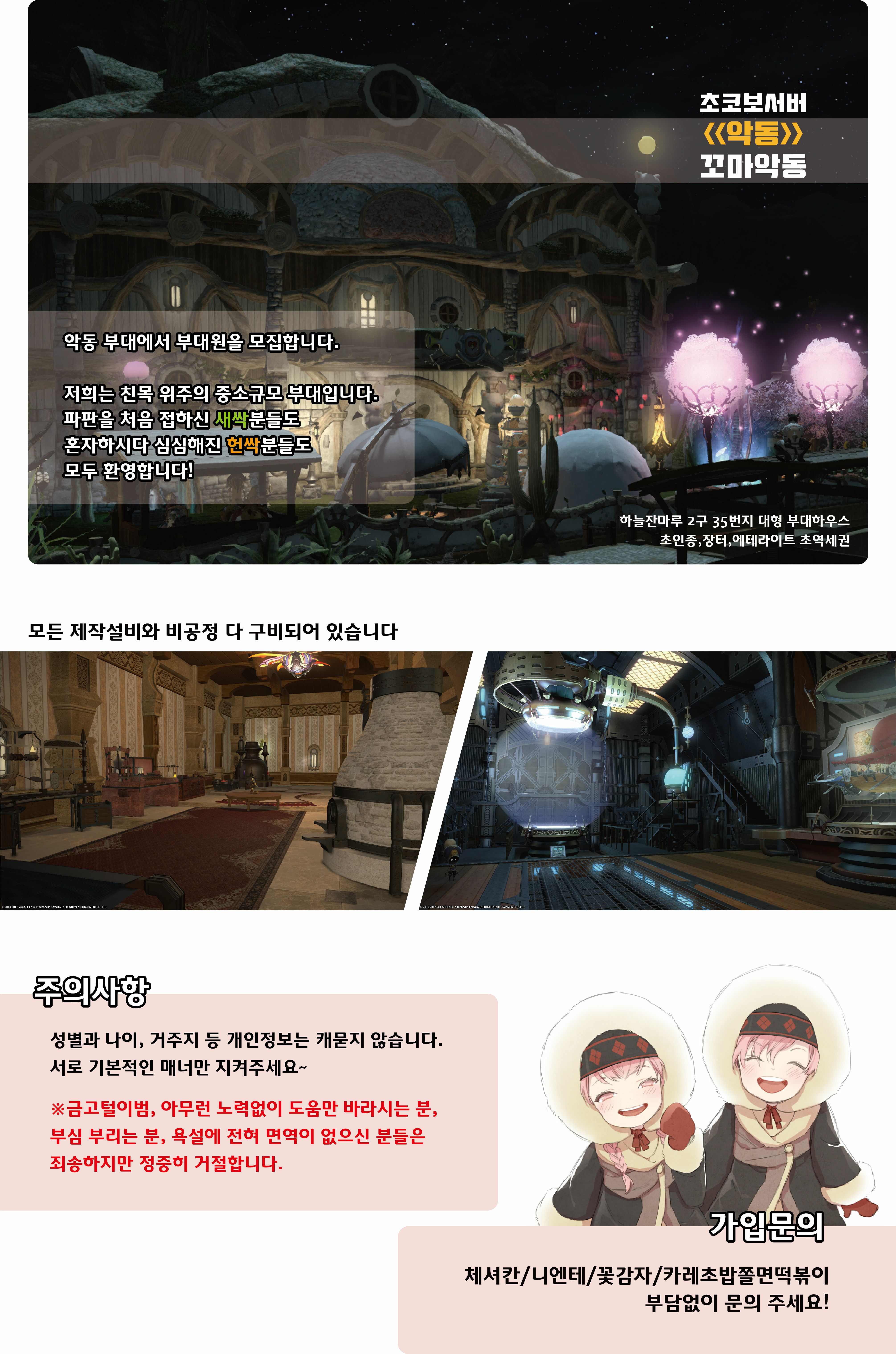 초코보 <악동>에서 새로운 부대원을 모집합니다[마감]![]() 부대원 모집이 마감되었습니다 관심가지고 문의주신분들 모두모두 감사합니다 'ㅂ`// |