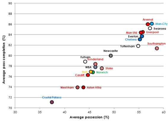점유율과 패스성공률의 상관관계는 다른 팀들의 기록을 보듯 분명히 연관이 있습니다. 일직선 상에 벗어난 사우스햄튼이 눈에띕니다.