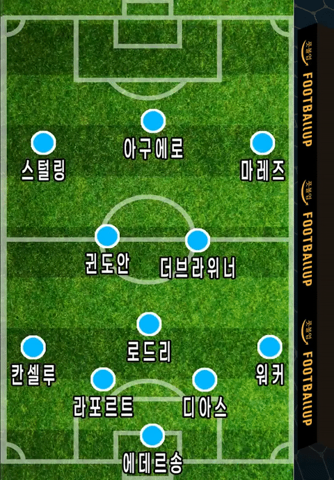9.5번의 스트라이커를 구현하기 위해 원톱은 CF로 두고 뒤에서 침투와 중앙에 위치를 걸어주세요. 스털링은 윙에서 중앙으로 치고 들어오는 윙어 구현을 위해 LW 마레즈는 윙어+플레이메이킹을 보여주므로 RF 덕배는 메짤라 역할이니까 RAM 귄도안 LCM 로드리는 하프백 구현을 위해 SW... 진짜 항상 느끼지만 이렇게 구현하면 반쪽짜리라... 항상 커서 잘 잡아주세요. 그 방법 뿐이에요. 항상 느끼지만 CDM가출을 뭔 쑈를해도 못 막는 다는게 말이 되는 엔진입니까... 웃긴건 커서도 맘대로 잡는게 어려움ㅋㅋ;; 칸셀루는 LWB 라포르트는 올라오는 센터백 구현을 위해 LB에 두고 후방 대기 꼭 걸어주세요. 안 그러면 칸셀루 보다 위로 올라옵니다. 디아스는 CB 워커는 RWB로 두고 오버래핑 공수참여도 3/3 걸어주면 실축 워커처럼 움직여 줍니다. 덕배를 RAM으로 뒀기 때문에 워커가 확실히 중앙으로 RCM덕배를 뒀을 때보다 많이 치고 올라와요. 개인전술/팀전술은 실축 구현을 위해 설정해 둔 것이니, 본인 스타일에 맞게 커스터마이징은 언제나 자유롭게 설정해 주세요. # 인게임 쿠키영상