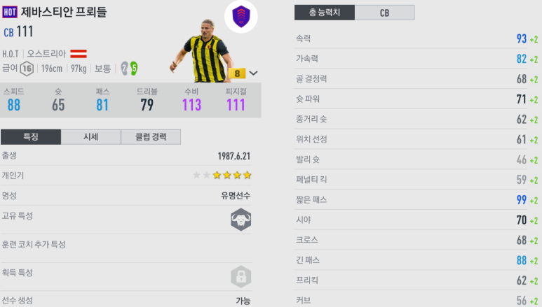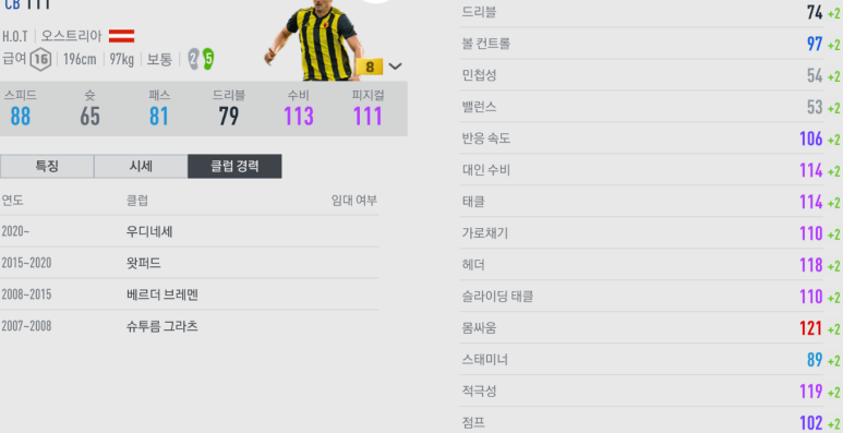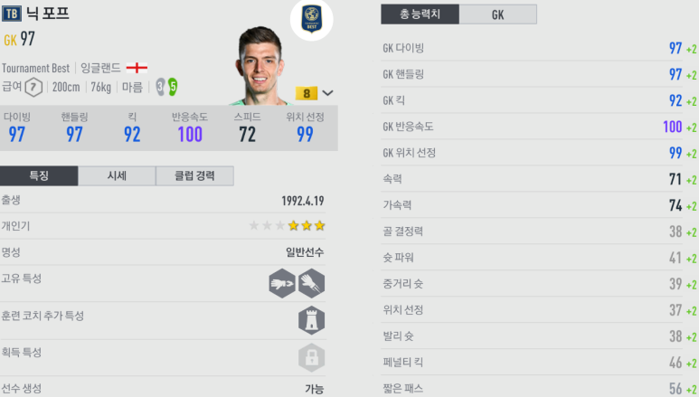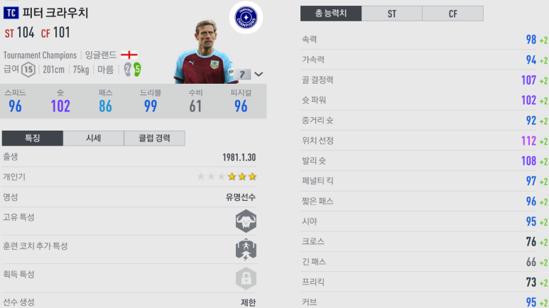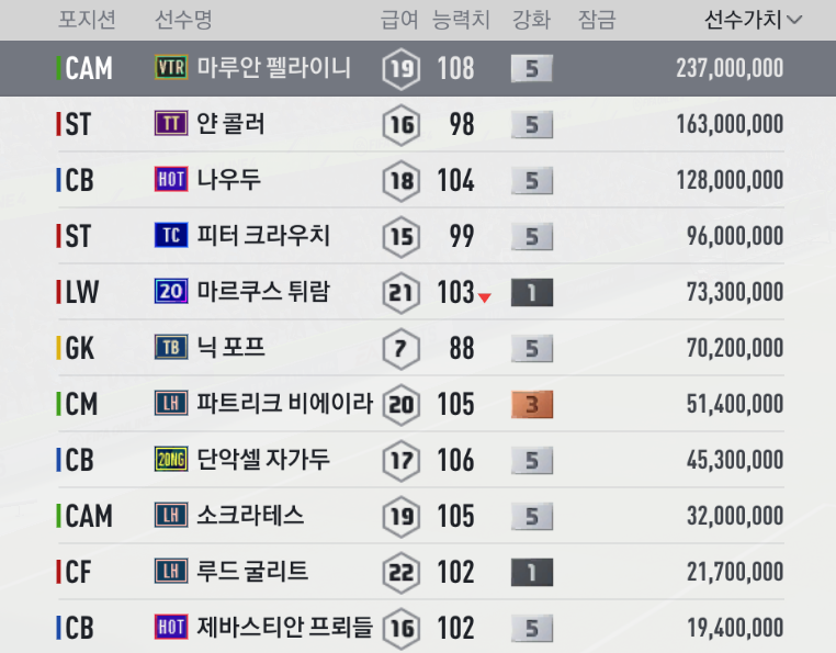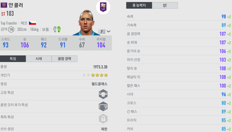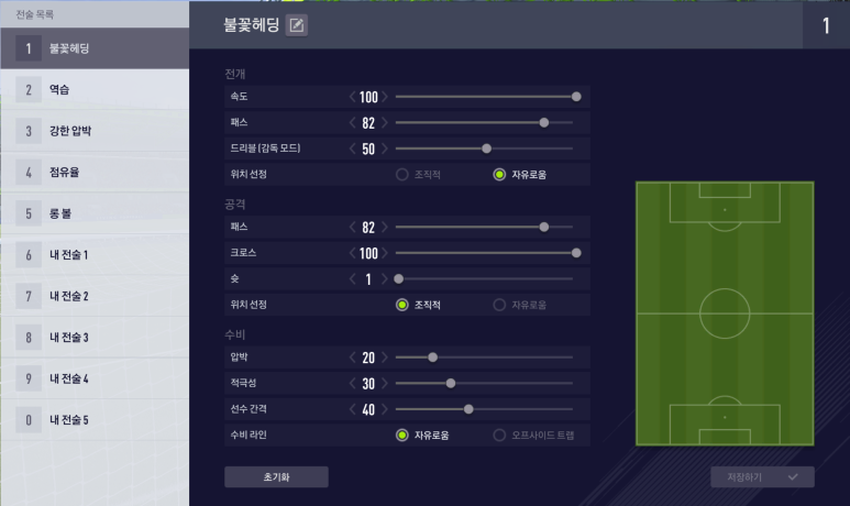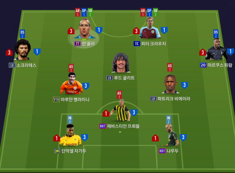 앞서 말씀드린대로 거인팀은 헤딩은 그냥 프리미엄 옵션이고, 상대방을 강력한 몸통박치기로 튕겨내면서 미식축구처럼 전진하는 개념입니다. 타겟맨을 하지않고 뒷공간 침투로 두는 게 좋습니다. 타겟맨을 두면 고립이 되서 차단당해요. 윙백이 없는만큼 따라붙어서 수비하는 게 아니라 수비 위치를 지키면서 패널티 박스를 채운단 느낌으로! 팀전술에 속도와 패스가 좀 높지요? 워낙 장신팀이 달리기가 느리다보니 공격진 올라가면 내려오지 못하게 하려는 속셈입니다. 어짜피 시원하게 뻥 걷어내서 헤딩으로 베드민턴식 티키타카로 경기를 풀어가야하거든요 ㅋㅋ 전부다 파워 헤더 특성을 달고 있기 때문에 개나소나 헤딩하러 뛰어들어가려해서 슛 수치는 1~ 크로스는 100으로 윙은 윙답게 측면으로 퍼져서 가운데 아무나 헤딩 받아먹어라 플레이하기! 공격시 조직적으로 위치선정을 둬야 크로스할 인원이 생깁니다. 절대 자유로움 하지마세요.. 수비 수치는 수많은 연구 결과, 저 수치가 딱 빈 공간을 채워주기 좋았습니다. 패널티 박스내 가득 채운 5수비(2CDM+3CB)로 골대를 막아주세요~ 뺏을 수 있겠거니 하다간 강력한 몸통박치기가 독이 되어 패널티킥 줍니다... 답답하더라도 절대 공 뺏기 금지! 무조건 튕겨나온 공 뻥 걷어내서 높이싸움한단 인내심 길러야 합니다. 선수 체감 및 후기 선수후기 말씀드립니다. LH 얀 콜러 +7 고유특성 : 파워 헤더 2미터가 넘는 키에 100키로가 넘는 터치다운용 공격숩니다. 가장 마음에 드는 점은 헤딩을 알아서 최선의 선택으로 시도한다는 점입니다. 로켓트 골찢헤딩부터 로빙헤딩, 원바운드 찍는 헤딩, 레이저 속사포헤딩까지 공만 띄워주고 D키 갈겨주고 있으면 알아서 최적의 헤딩을 선택해서 구사하더라고요.. 헤딩개인기는 최고입니다. 생각보다 발밑도 좋아서 센터백 달고 탱커식으로 우겨들어가 골찢슛 갈기면 됩니다. 스피드가 아닌 순수한 힘으로 라인브레이커할 때의 그 쾌감ㅋㅋ 마! 이게 라인 브레이커다! 아쉬운 점은 생제가 걸려서 매물이 없습니다.. 저도 강화로 띄우는 중이에요ㅠㅠ. 그리고 턴 하는데 한 세월 걸립니다.. 몸쌈뿐인 바보라 턴하면 뺏겨요. 어짜피 코너킥 얻어서 헤딩으로 박살내면 되니까 굳이 방향전환 하려다 역습주지 마시고 미련없이 코너킥 유도 슛팅 하십시오.. 얘쓰면 상대편의 심리적 부담감이 저한테까지 전달됩니다. 맨날 메시 호날두같은 휘청이들 공만 톡톡 뺏어오다가 운석같이 밀려오는 중압감에 전반까진 쩔쩔 맵디다. 그리고 웃긴 게 공 걷어내다가 얘 머리에 맞고 역습찬스 강제로 발생할 때가 종종 있어요. 편하다 편해! TC 피터 크라우치 +7 고유특성 : 파워 헤더 크로스할 땐 콜러를 보고 하는 게 아니라 얘보고 올리셔야 합니다. 그럼 다른 애들이 끊어먹기 헤딩을 하던 뭘하던 대신 넣어줘요. 최고의 어그로이자 에임입니다 ㅋㅋㅋ. 물론 얘가 직접 헤딩할 때도 있지만 항상 석궁처럼 휘었다가 헤딩을 해서리.. 좀 헤딩이 느려보이기 때문에 답답함을 좀 느낍니다. 헤딩스타일이 무슨 빠따로 공을 치는 느낌이에요. 뭔가 장대높이뛰기의 장대의 탄성같은 '흔들흔들 띠용~'같달까요.. 발밑은 약발이 안좋고 소녀슛 일관입니다만, 깔아차는 DD오른발슛만큼은 완벽합니다. 왜 이 슛만 잘하는 걸까요ㅠ 단점은 너무 휘청거립니다. 손만 닿아도 강풍맞는 갈대마냥 휘청휘청 거리는 게 여간 짜증납니다. 터닝도 흔들거리면서 위태위태.. 얘는 그냥 알아서 패널티 박스 들어갈 때까지 패스 냅두세요.. 다만 1선 학다리나 시체태클은 기가 막힙니다. 시체태클하면 하루종일 누워 있어서 그쪽으론 지공패스 절대 못해요ㅋㅋ 갑자기 학다리 쭉뻗어서 공만지는 기술이 패시브입니다. 우리팀 수비는 얘부터 시작이에요. 거인팀 상대로 뻥걷기는 공격찬스주는 거나 마찬가지니 상대편도 빌드업에서 스트레스 엄청 받아요. LH 루드 굴리트 +5 고유특성 : 화려한 개인기·플레이 메이커(AI)·스피드 드리블러(AI)·파워 헤더 굴멘에 대해 설명 필요하나요? 어느 분 말씀대로 단점이라곤 골키퍼 스탯 뿐인 그저 킹갓개사기 피온4 최고의 선수! 전봇대 둘이서 쾅쾅 헤딩해서 튀어나온 볼 마무리부터 윙을 도와 크로스, 중거리 찬스 해결사, 수비가담, 킬패스 등등 모든 걸 도맡아하는 거인팀 최고 중요한 포지션입니다. 그만큼 체력소모가 심합니다. 경기 끝나면 걸레짝이 되어있는데 참 미안한 마음 뿐이에요.. 다른 좋은 팀갔으면 이딴 개고생은 안했을텐데ㅠㅠ LH 소크라테스 +7 고유특성 : 화려한 개인기·테크니컬 드리블러(AI)·중거리슛 선호(AI)·파워 헤더 CAM에 두는 게 최선인데 굴멘만큼 플레이가 시원하지 못해서 오버롤 -1 감수하고 윙으로 보냈습니다. 굴멘보다 크로스를 더 잘올리기도 하고.. 일단 강뚝을 달고 있는데 이상하게 헤딩을 못해요. 다른 애들이 너무 잘해서 그런걸까요.. 아닙니다 아무리 생각해도 강뚝없는 것 같아요ㅠ 대신 거인 중에선 가장 섬세한 발밑 플레이 가능합니다. 양발이라 감차각 나온다면 고민없이 때리세요! 얄밉게 골대 맞고 들어가는 골로 득점합니다ㅋㅋ 싹슛이 없어요 맨날 쿠션골 넣음. 프리킥, 코너킥 등등 데드볼은 얘