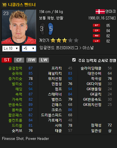피파온라인3 챔피언쉽에서 대박난 이후로 가격이 잠깐 올랐던 10 벤트너입니다. * 니콜라스 벤트너의 장점 1. 체감 194cm라는 키에는 분명 어울리지 않는 가벼운 체감을 보여줍니다. 초반엔 좀 무거울 수 있는데 키울수록 부들부들합니다. 민첩성이 낮은데도 불구하고 바디페인팅이 부드러우며 개인기 없이 방향키로만 방향전환을 하는것도 꽤 빠릅니다. (방향키로 수비수 2~3명 벗겨내고 골 넣기도 충분히 가능할 정도로요.) 2. 헤딩 능력 아스날 올스타 시절에 잠깐 4132를 쓴 적이 있었는데 윙 같은 공미로 나스리와 아르샤빈을 썼습니다. 얼리크로스를 자주 사용했는데 다 받아먹습니다. 공중볼 따내는 능력은 즐라탄. 드록바 안 부럽습니다. 수비수 사이에서 헤딩으로 골문 위협할때도 많고 골키퍼가 골킥 찼을때도 헤딩 따서 패스해주는 경우도 많고 헤딩은 진짜 벤트너 따라올 선수 잘 없다고 생각합니다. 3. 골 결정력 피네스 샷이 달려있습니다. 남자답게 잘 넣습니다. DD, ZD 잘 들어갑니다. 패널티박스 측면 쪽에서도 뽀록으로 ZD 들어갈때가 많은데 별로 안 감기는게 살짝 단점이긴 합니다. 센스 있는 분이시라면 ZD 멀리서도 잘 넣으실듯. CA 슛 같은 경우는 깔끔하게 톡 찍어차는데 멋짐. 4. 연계 연계 플레이가 상당히 좋습니다. '앙리 - 반 페르시 - 벤트너'로 이루어진 공격진인데 벤트너로 해결 불가능 할때 수비 등지고 뒤로 흘려주는 플레이라던가 2:1 패스로 순식간에 골키퍼와 1:1 상황을 만든다던가 그런 플레이에 잘 어울리는 선수입니다. * 니콜라스 벤트너의 단점 1. 침투 쓰루 패스로 순식간에 벽 허무는 걸 좋아하는 저로써 침투가 살짝 답답했습니다. Q 3~4번 갈겨줘야 겨우 달리기 시작하는데 쓰루 패스 찔러줄 때 멈추는 경우가 있습니다. 큐떡 같은 경우는 그나마 잘 받아줘서 다행이네요. 2. 달리기 즐라탄에 비하면 빠르지만 답답한건 어쩔 수 없습니다. 코시엘니나 라모스 같은 선수 만나면 끊길때가 많아요. 패스로 커버할 수는 있는데 느린건 사실. -