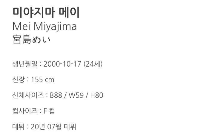 미야지마 메이Mei Miyajima宮島めい 생년월일 : 2000-10-17 (23세)신장 : 155 cm신체사이즈 : B88 / W59 / H80 컵사이즈 : F 컵 별들 - 오 둘 하나 출처 : https://ggoorr.net/ao/17378647