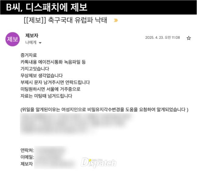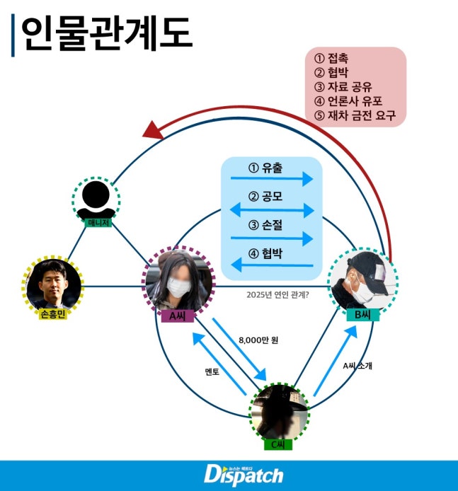 [단독] "임신, 두 남자에게 연락했다"…손흥민, 공갈 사건의 반전![]() 먼저, A씨(전여친)와 B씨(2차 협박범)의 대화다. B씨 (협박범) : 근데 너, 누구 애인지 알아? 누구 애인지 정확히 알아? A씨 (전 여친) : 누구 애인지... 제가 어떻게 알아요? B씨 (협박범) : 그럼 2번한테만 가든가, 1번한테만 가든가. 1명한테만 갔어야죠. ![]() 해당 녹취록에 따르면, A씨는 비슷한 기간에 2명의 남성과 관계를 맺었다. 둘의 대화에 등장하는 1번은 사업가. 2번은 국가대표 축구팀 주장 손흥민이다. A씨는 2명에게 임신 소식을 전했다. 1번은 무대응, 손흥민은 응답. 그러자 손흥민에게 검사 결과 (hCG 수치 5000mIU/mL)를 보내며 "임신 5~6주"라고 밝혔다. 그러나 A씨 역시 누구의 아이인지 확신할 수 없었다. (본인은 손흥민일 확률이 높다고 주장했다) 이에 B씨는 2차 협박을 망설이기도 했다. 다시, 둘의 대화를 들어보자. ![]() B씨 (협박범) : 근데 네가 네 입으로 그랬잖아? 양쪽에 연락 다 했다며? A씨 (전 여친) : 양쪽에 얘기했죠. B씨 (협박범) : 누구 애인지 정확하게 모르면서. 너, 그게 혼인빙자 사기라고. 양쪽 남자한테 똑같은 말을 했다는 거 자체가! 그래서 지금 내 대가리가 아픈 거라고. 이걸 어떻게 봐줘야 될 지 모르니까. ![]() '디스패치'가 손흥민 협박 사건의 알려지지 않은 진실을 취재했다. 사건의 전말을 파악하기 위해 먼저 등장인물에 대한 이해가 필요하다. A씨 (전 여친) : 29살, 여성이다. 프리랜서로 제품 광고 모델 일을 한다. 손흥민과는 지인의 소개로 처음 만났다. (2024년 5월에 다른 남자도 있었다.) B씨 (협박범) : 41살, 남성이다. 공갈미수 전과가 있다. 상반신에 이레즈미(문신)를 새겼다. A씨와는 2024년 연말에 만났다. 2차 협박을 주도했다. C씨 (무당) : 유명 무속인이다. C씨는 A씨의 6월 임신을 예언했다. 점사가 맞아떨어지자, 신뢰가 깊어졌다. C씨는 낙태 수술을 할 때도 옆을 지켰다. A씨는 C씨에게 8,000만 원을 입금하기도 했다. ![]() ◆ 그날의 결정 이 사건은 애초 그리 복잡한 구조가 아니었다. 손흥민과 전 여친 A씨의 성관계. 그리고 혼전 임신. A씨가 먼저 3억 원을 요구했고, 손흥민이 받아 들였다. A씨는 6월 22일, 임신 테스트를 시도했다. 손흥민에게 2줄임을 알렸다. 그리고 이틀 뒤, 산부인과를 찾았다. hCG 결과는 5000mIU/mL. 임신 5~6주에 해당하는 수치였다. A씨는 24일 손흥민(과 여성 매니저)을 만났다. 이미 중절을 결심한 상태. 문자로 한 번, 대면으로 한 번, "내 입장은 바뀔 일이 없을 것"이라 말했다. A씨는 입금을 확인했고, 25일 수술을 받았다. A씨는 그 뒤로 손흥민에게 연락하지 않았다. 손흥민도 마찬가지. 둘의 인연은 그렇게 마무리됐다. 2차 협박범 B씨가 등장하기 전까지, 누구도 그 일을 입 밖에 꺼내지 않았다. ![]() ◆ 악연의 시작 B씨는 공갈미수 전과를 갖고 있다. 그는 지난해 12월, 친한 동생 (무속인 C씨)의 소개로 A씨를 만났다. 한 마디로, 악연의 시작이었다. B씨에 따르면, 지난 1월 연인 관계로 발전했다. 그는 '디스패치'에 "A씨와 결혼을 앞두고 있었다"면서 "A씨의 위임을 받아 제보한다"며 연락을 해왔다. "제가 결혼을 앞두고 있어요. 그런데 우연히 A씨 휴대폰에서 비밀유지각서를 발견했어요. 위약금이 10배더라고요. 너무 편파적이에요. 사례비 2,000만 원을 주시면 자료를 드리겠습니다."(B씨) B씨는 손흥민 측에도 이런 방식으로 협박했다. "손흥민이 내 여자를 (과거에) 임신시키지 않았냐. 위약벌 조항이 너무 과해서 A와 결혼할 수가 없다"며 접근했다. ![]() ◆ 판도라 상자 손흥민 측은 대응하지 않았다. (A씨가) 말하지 않으면 일어나지 않을 일. 그러자 B씨는 전략을 바꿨다. 언론사에 (편파적) 위약벌을 제보하겠다는 것. 그 언론사가 '디스패치'였다. 손흥민 측은 "서약서를 변경할 계획이 없다"고 거절했다. B씨는 다시 태세 전환. 돌연, "A씨를 공갈 및 사기로 고소하라"며 자료를 전달했다. 대신 조건을 내걸었다. 7,000만 원만 달라는 것. "A씨와 B씨의 관계가 왜 틀어졌는지 모릅니다. 갑자기 A씨와 나눈 통화, 문자 등을 보냈어요. 그러면서 A씨와 무당 입단속 시키느라 8,000만 원이 들었다며 7,000만 원을 내놓으라 했습니다." (손흥민 측) 판도라 상자가 열렸다. 손흥민 측은 상상도 못 했던 사실과 마주했다. A씨가 2명의 남자를 만났다는 것. 그래서 누구의 아이인지 모른다는 것. 단번에 3억 원을 요구했고, 단칼에 수술을 진행한 이유였을까. ![]() ◆ 두 남자의 확률 한국 축구의 숙명처럼, 경우의 수를 따져야 하는 상황이 발생했다. '디스패치' 취재 결과, 1번남 2번남(손흥민) 모두에게 확률은 있었다. 다만, 손흥민이 A씨의 말을 들어줬을 뿐이다. 손흥민은 2024년 5월 23일, 북중미월드컵 아시아 지역 2차 예선을 위해 입국했다. 당시(23일), A씨는 한국에 없었다. 1번남과 함께 일본 여행 중인 것으로 파악된다. A씨는 5월 30일에 돌아왔다. 그리고 손흥민에게 연락했다. 두 사람이 만날 수 있던 시간은 5월 31~6월 1일 사이. 손흥민은 6월 2일 싱가포르 경기를 앞두고 출국했다. A씨의 '교차' 데이트는 B씨의 녹취록에서도 확인된다. 당시 B씨는 "누구 애인지 정확하게 모르면서 어떻게 양쪽 남자에게 똑같은 말(임신 소식)을 할 수 