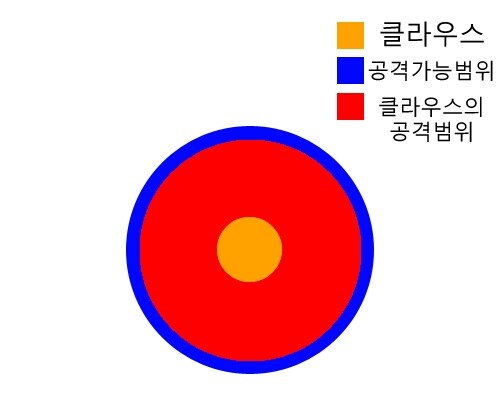 영상으로는 파악하기 힘든 부분이 있기에 그림을 준비했습니다. 타인에게 구체를 던질 때와 더불어 가장 뎀딜하기 좋은 구간인데요. 공방을 가보면 충격파의 범위가 매직애로우의 사정거리보다 긴 줄 아시고 그냥 가만히 있는 분들이 좀 계시더라고요. 일단 거리조절이 어렵긴 하지만 거리조절에 성공하면 매직애로우를 10발까진 무리 없이 먹일 수 있는 구간이니 영상을 보시면서 거리를 파악해보세요. 4) 타인에게 돌진할 때의 뎀딜 클라우스가 카록이나 피오나에게 돌진하는 경우엔 뎀딜타임이 조금씩 생깁니다. 뒤를 따라가면서 매직애로우를 2~3발씩 사용해주세요. 5) 머큐리를 이용한 뎀딜 Ⅱ. 회피타이밍 1) 검은 구체 피하기 검은 구체를 단거리에서 시전할 경우엔 앰버를 사용하고, 중거리~장거리일 경우엔 왼쪽이나 오른쪽으로 플라잉 스패로우 혹은 폴짝을 사용해 회피가 가능합니다. 물론 중~장거리에서도 앰버를 사용하면 피할수 있지만 검은 구체를 연속으로 맞을 경우엔 스태미나 관리가 어려우므로 앰버는 가능하면 단거리에서만 사용합니다. 2) 돌진 피하기 돌진을 피하는 방법도 검은 구체 피하기랑 비슷합니다. 단거리에서는 앰버, 중~장거리에서는 왼쪽이나 오른쪽으로 플라잉 스패로우 혹은 폴짝을 이용해 회피하시면 됩니다. 돌진 피하기를 실패했을 경우엔 바로 앰버를 사용하시는게 안전합니다. 3) 메테오 피하기 *47초부터 자신에게 어그로가 끌린 영상이 나옵니다. ⑴타인에게 어그로가 끌린 메테오일때 뭐 시계방향인가 반시계방향으로 도는게 일반적으로 알려진 방법이지만 자신한테 어그로가 끌리지 않은 이상 앰버를 사용하시면 메테오가 끝날 때까지 안전하게 살아남을 수 있습니다. 괜히 돌다가 눈먼 메테오 맞고 "으앙 아프다!" 하지말고 앰버안에 들어가시는걸 추천합니다. 굳이 주의해야할 점이라면 어그로 끌린 유저가 자신과 같은 선상에 있을 때인데, 이러한 경우에는 대형 메테오가 날아올 때쯤에 앰버를 풀고 다시 앰버를 사용하시면 됩니다. ⑵자신에게 어그로가 끌린 메테오일 때 메테오는 자신에게 어그로가 끌렸을 때 소형 메테오 1~3개 + 대형 메테오 1개가 날아옵니다. 일단 피하기 쉬운 중~장거리 메테오부터 설명하겠습니다. 중장거리 메테오의 경우엔 피하는 방법이 두 가지가 있습니다. 첫 번째 방법으로는 자신에게 날아오는 소형 메테오 2개를 앰버로 막은 다음에 바로 앰버를 풀고 마지막으로 날아오는 대형 메테오를 다시 한 번 앰버를 사용해 막는 방법이 있습니다. 두 번째 방법으로는 왼쪽이나 오른쪽으로 8걸음정도 뛰어서 자신에게 날아오는 소형 메테오 2개를 피한 다음, 마지막으로 날아오는 대형 메테오를 앰버로 막는 방법이 있으니 상황을 봐 가시면서 적절히 이용하시면 됩니다. 주의하실 점은 가끔 대형 메테오까지 막은 후에 클라우스가 바로 뛰어오는 경우가 있는데 이러한 경우엔 앰버가 깨지면서 대미지를 입게 됩니다. 단거리에서 어그로가 끌린 경우에는... 상황에 따라 다르지만 매직애로우를 연사하다가 걸린 경우에는 후딜 때문에 피하기 매우 어렵습니다. 이러한 경우에는 변신을 이용해서 회피하도록 합시다. 그냥 주위에서 배회하다가 어그로가 끌린 경우라면 최대한 뒤로 빠진 후에 중장거리 메테오를 피하는 방법을 이용하세요. 그리고 가끔 버그 때문에 마지막으로 날아오는 대형메테오가 투명하게 보이는 경우가 있습니다. 자신에게 어그로가 걸렸다면 항상 마지막으로 대형메테오가 날아오니까 보이지 않는다고 절대 안심하지 마세요. ⑶메테오를 완벽히 피하는 세이프 존 ![]()