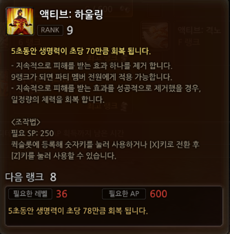 지그린트 감전에서나 사용하던 하울링이 시즌3 보스들이 사용하는 각종 저주도 제거할수있습니다. (쿨도 짧고 sp도 250사용이니 자주 써줍시다.) 9랭크부터는 파티원 전원에게 적용 가능하니 적어도 9랭크는 찍어줍시다.
