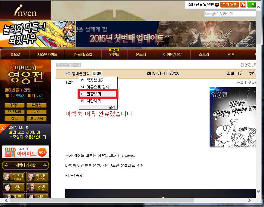 먼저 게시글에 마격받는 사람의 닉네임을 클릭합니다. 그럼 인장보기 탭이 있는데 선택해줍니다.