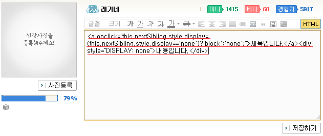 [게시판 정보] 접기 태그에 대하여.한창 때 유행이었다가 시들었던 접기 태그, 요즘 들어서 다시 여쭤보는 분들이 많으시네요. 그리하여 원래 게시하려다가 관두었던 접기 태그에 대한 설명을 좀 가공하여 게시합니다. 찬찬히 읽어보시면 접기 태그를 사용하는데 좀 도움이 되실겁니다. 1. 접기 태그란 무엇인가? 접기태그는 html의 style속성을 제어하여 특정 글이나 그림을 클릭 하였을때, 내용을 펼쳐서 보여주는 형식의 태그에 대한 통칭입니다. 쉽게 말해서 버튼을 누르면 아래쪽에 글이 나타나는 것이지요. 예를 들어보자면, 이런 것이죠. 접기 태그의 기본 형태는 다음과 같습니다. <a onclick="this.nextSibling.style.display=(this.nextSibling.style.display=='none')?'block':'none';">제목입니다.</a><div style="DISPLAY: none">내용입니다.</div> 위에있는 접기태그의 예시는 다음과 같은 html코드를 이용하여 만들어졌습니다. <a onclick="this.nextSibling.style.display=(this.nextSibling.style.display=='none')?'block':'none';">이것은 접기 태그입니다.눌러보세요.</a><div style="display: none; "> 접기태그는 버튼을 누르면, 보이지 않게 설정되었던 단락을 보이게 하는 기능을 합니다. 다시 접으시려면 아까 눌렀던 글을 다시 눌러주세요.</div> 얼핏 보면, 꽤나 머리 아파보이는 글자들의 나열입니다. 하지만 하나하나 풀어보면 그렇게 어렵지 않습니다. 그렇다면 하나 하나 풀어보도록 하지요. 2. 접기태그를 하나하나 알아보자. 이번에는 접기코드에 대해서 하나하나 내용을 알아보도록 하겠습니다. 접기코드의 내용에서 각 부분이 어떤 역할을 하는지 알아보면서 접기 코드를 작성 할 때, 주의할 점도 몇 가지 알아보도록 하겠습니다. 코드의 앞에서부터 차근차근 설명해 드릴터이니, html과 담을 쌓고있다고 미리부터 겁먹지 않으셔도 됩니다.. <a onclick="this.nextSibling.style.display=(this.nextSibling.style.display=='none')?'block':'none';">제목입니다.</a> 태그의 맨 처음을 보면 "<a" 라는 부분이 눈에 들어오네요. <a herf="경로주소"></a>의 형식으로 클릭을 하면 해당 주소로 페이지를 이동하는 명령태그죠. <a>라는 태그를 한 마디로 말씀드리자면, 어떤 명령을 수행하는 "버튼"을 만들겠다는 말입니다. 버튼을 마우스로 클릭하게 되면, 써있는 명령을 수행하게 되는 것입니다. 내릴 수 있는 명령은 여러가지가 있을텐데, 그중에서 "<a herf=" 라고 쓰면 이동을 하라는 내용인것이죠. 그렇다면 접기태그에 쓰인 "<a onclick="이라는 것은 어떤 것이냐? onclick, 말 그대로 해당 버튼을 누를때마다 그 아래의 내용을 실행하라는 뜻입니다. "이동 명령은 그런거 안써도 누르면 알아서 한다. 그런데 구지 저런걸 왜쓰느냐?"라고 물어보신다면.. 이런저런 긴 답변이 되야 하므로, 그냥 접기 태그와 같은 속성제어를 위해서 쓰였다.. 정도까지만 이해하시면 됩니다. 그리고, 두번째 부분으로 따옴표 안에 길다랗고 무슨말인지도 모를 무언가가 잔득 나옵니다.. this.nextSibling.style.display=(this.nextSibling.style.display=='none')?'block':'none'; 길기도하네요.... 사실 태그에서 따옴표 안에 나타나는 내용은 명령 수행의 내용을 나타내는 것입니다. 설명하자면 nextSibling(적당한 한글말이 생각나지 않네요...)의 속성을 이렇게 제어하라는 말입니다. 구지 깊히 이해하실 필요는 없습니다. 아시는 분에게는 너무 간단한 내용이지만, 전혀 관심분야가 아닌 분에게는 그냥 머리 아픈 잡소리일 뿐이니까요. 간단히 말씀드리자면, 이부분이 실제 접히고 펼쳐지는 태그에서의 핵심 내용이라는 겁니다. 글자 하나 바뀌면 안되는 부분이기도 하지요.. 세번째 부분은 제목입니다.</a> 입니다. 처음으로 한글이 등장했네요. 말그대로 제목을 입력하시면 되는 부분입니다. 설명을 위해서 한글로 적어놓긴 했지만, 이곳에는 수많은 객체들이 들어갈 수 있습니다. 저처럼 접기태그를 보기 편한 글을 작성하기위해서 쓰신다면 보통 글자가 들어가긴 하지만, 인장게시를 위해서 접기 태그를 사용하신다면 보통 그림이 들어가겠지요. 그럴때는 이미지 링크 태그인 <img src="이미지주소">를 "제목입니다"글자 대신에 넣어주시면 됩니다. 세번째 부분의 마지막</a>는 맨 처음의 "<a onclick="">"의 닫기 태그로 "여기까지 쓰여진게 버튼이다."라는 의미입니다. 여기까지, 세 부분이 합쳐져서 접고 펼쳐질 때 클릭하여 사용할 버튼이 완성 되었습니다. 이하의 부분은 클릭을 했을 때, 펼쳐질 "내용"이 어떤 것이냐를 설명해주는 것입니다. <div style="DISPLAY: none">내용입니다.</div> "<div " <div>태그는 새로운 문단을 만든다는 의미를 가진 태그입니다. 다시 말해 내용이 될 글이나 그림을 새로운 문단으로 작성 한다는 말이지요. 그렇다면, 새로운 문단을 만드는데 그 문단이 어떻게 생겨먹은 문단이냐? 그것은 그 뒷 부분이 지정해 줍니다. "style="display:none">" style는 말그대로 스타일입니다. 새로 생길 문단의 형태등을 지정해 주는데 사용됩니다. 그렇다면 문단의 display가 none가 되겠네요. 네 말그대로 "표시"를 " 하지 않겠다"라는 말입니다. 여기까지 읽어보셨으면 어느정도 감을 잡으셨겠지만, 접기 태그는 버튼 뒤에 써놓은 문단 스타일의 "display:none"속성을 바꿈으로써 보이게 하거나 안보이게