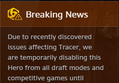 트레이서 밴과 관련된 코멘트![]() 안내에 따르면 트레이서가 버그로 인해 글로벌 밴이 된 것처럼 나왔지만, 실질적으로는 밴되지 않고 선택이 가능합니다. 이와 관련된 블리자드의 코멘트입니다. ![]() [-] Spyrian 커뮤니티 매니저 저희가 최대한 신속히 이 버그를 고칠 수 있도록 작업중이기에, 트레이서를 실질적으로 게임에서 글로벌 밴을 하거나 하지는 않을겁니다. 저희의 목표는 내일 아침까지 이 버그를 수정해 적용하는 것이며, 추가적인 공지가 나온다면 여러분께 알려드리도록 하겠습니다. |