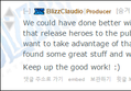 ![]() [-] BlizzClaudio 프로듀서 이 부분에 관해서는 더 많은 대화를 통해 개선될 수 있다고 생각합니다만, 저희는 앞으로 영웅들이 출시되는 패치에 대해서 더 자주 PTR을 이용하려고 합니다. 저희는 PTR 서버를 통해 엄청난 양의 도움을 받고 있습니다. 그렇기에 저희는 이 부분의 이점을 살려 본 서버가 가능한 한 안정적이도록 유지되도록 하려고 합니다. PTR이 패치된지 반나절밖에 지나지 않았지만 벌써 많은 멋진것들을 알아냈으니까 말이죠. 계속해서 좋은일 부탁드립니다! :) |