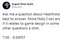 개발자 트위터 Q&A 요약![]() 딘 아얄라의 트위터에서 진행됐습니다. -클래식 세트에 대한 재작업이 있을 것, 조만간 공지될 것이고 좋은 변화임 -전장은 여전히 인기가 높아지고 있다 -결투가 곧 업데이트 될 예정, 여전히 제한된 세트로만 진행될 것임 -말리고스는 명전행 목록에 여러번 이름을 올렸지만 번번히 미끄러짐 -가젯잔 경매인은 2년간 너프를 피했었다. -하스 초기에 흑마 영능을 변경할 계획을 했지만 마땅한 아이디어가 없었다 -(마이에브 초상화를 다시 팔거냐는 질문) 예전 뒷면, 초상화를 다시 팔 계획은 있으나 아직 마이에브를 팔 계획은 없다 -토르톨란 마법사는 예상하지 못한 덱이었다. -수수께끼의 도전자와 영혼 발톱이 그렇게 강력할진 몰랐다. 수수께끼가 강한건 마음에 들었지만 영혼 발톱땐 마음에 들지 않았다. -떡대 컨셉은 밸런스 미스였다. 격려는 재설계할 시간이 없었기 때문에 너무 강한 힘을 싣지 않는게 안전하다고 여겨졌다. -중국 서버에서 토너먼트 대회를 진행중인걸 알고 있었으나 지금 타이밍을 놓치면 1~2주 후에나 너프를 할 수 있었기 때문에 다수의 유저들을 위해 밴클 너프를 진행했다. -살아 움직이는 빗자루 너프가 고려됏으나 흥미롭고 게임을 색다르게 만들기 때문에 보류 -공허 학살자는 많이 쓰이지 않았지만 자신이 좋아하는 카드 -암흑 사제 컨셉을 다시 만나볼 수 있을 것 -이중 직업이 다시 나올 수도 있을 것 -묘지 개념에 관심이 있지만 좋은 테마와 디자인 UI가 확실하지 않다. -전체 덱이 쓸모없지 않게 하는 방향으로 카드를 너프 하고 있음 -버프는 너프보다 메타에 미치는 영향이 적으므로 상대적으로 덜 할 예정 -자신이 좋아하는 카드는 모독, 크툰, 광포한 격노 -무작위 카드 뒷면처럼 무작위 영웅 기능도 넣을지도 모른다. -맥시밀리언을 카드로 내고 싶었는데 기회가 없었다 |