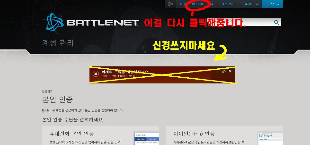 [배틀넷 오류] 휴대폰 인증 안되시는분들 보세요현재 배틀넷 신규 회원가입 과정에서 휴대폰인증을 한후 이미 계정이 있다고 뜨면서 계정찾기를 하면 계정이 없다고 뜨는 무한루프가 반복되고 있는 현상이 발견 되었습니다. 사실 며칠전 폰스스톤 나왔을때부터 인식을 하고 있었지만 블리자드에서 조치를 취해줄 것이라고 생각했는데 조치를 취하기는 커녕 구글플레이스토어 댓글도 안보는것 같아서 팁글을 올립니다. ※ 이런 심각한 문제가 있었는데 인벤에서 언급이 안된 이유는 인벤유저들은 이미 배틀넷 아이디를 가지고있었기 때문에 이러한 현상을 겪지 않고 바로 로그인을 했기때문에 별로 문제시 되지 않았던 것 같습니다.