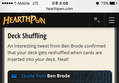 카드 한장을 덱으로 섞어 넣을때 발생하는 일![]() 어떤 특정 위치에 카드가 섞여 들어가는게 아니라 모든카드가 다시 셔플된답니다. 벤브로드가 언급. 앨리스나 생매장 같이 한장이 덱으로 섞여 들어갈때 입니다.