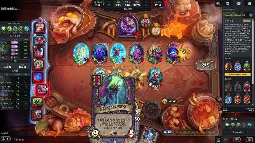 중반 이제 계속 버티도록 합시다. 3체력 이상 하수인이 그리 많지는 않으니기회가 되면 신성화로 쓸어버릴 수 있습니다. 공략 2분 20초쯤에 신성화를사용할 수 있음에도 사용하지 않았습니다. 로밀로를 죽이면, 다음턴에 4/2로 살아나기 때문에 로밀로가 죽지 않을 때 신성화를 사용해야 합니다. 이를 위해서라면보호의 손길도 로밀로에 사용해줍시다. 적이 헌신적인 영웅을 사용하므로 이를 이용해서 로밀로에 천상의보호막을 걸어주도록 합시다. 각 카드 간략한 사용법 왕의 축복은 블러드후프 용사를 뚫는 데 쓰면 좋습니다. 이외에도 보호의손길과 연계해서 사원집행자 태양길잡이를 뚫는 데에도 사용할 수 있습니다. 실버문 차원문도 같은 용도로사용하시면 됩니다.