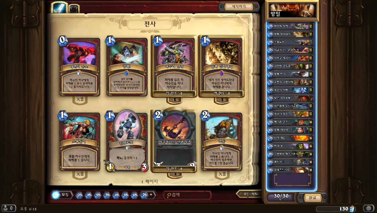 방밀 덱 조언 좀 부탁드립니다.하스 초기에 2만원만 지르고 했다가 되도 않게 방밀 해보겠다고 오늘 5만원 질렀는데 존스, 게돈, 알렉 나와서 좀 해볼만 하다고 생각해서 남은 가루로 이것저것 손 봤습니다. 조언 부탁드립니다.