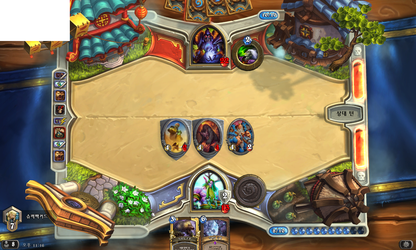 힐을 너무 사랑한 거흑의 최후![]() 상대 거흑의 손에 남은 패가 자락 / 용거 / 용거 / 올빼미or압도 추정.. 키카드를 아무것도 낼수가 없는 안타까운 상황이네요 ㅎㅎ 그나저나 간만에 드루하는데 힘드네요. 주수리 500승 달성해서 드루로 바꿧다가 등급이 주르륵.. ㅠ 냥꾼한테 털리고 빡쳐서 떡도발 덱 들고오면 거흑이나 성기사만 계속 걸려서 털리고... 승질나서 기계드루 들고 오면 귀신같이 냥꾼이나 어그로법사 만나서 박살나고... 중간이 없네요 ㅠㅠ