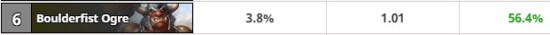 좋은 카드가 아니라는 것은 다 알지? 정 뽑아야만 하는 상황이라면 '운명의 파멸.. 운명의 파멸..' 하면서 뽑는 카드야. 그냥 운파를 집었는데 재수없게 4/2만 나온다고 생각하자. 운파처럼 반드시 잡아야만 나오는 것도 아니니 운파보다 좋다고 생각 해도 OK. 농담이고 경쟁자들이 맛이 간게 아니라면 안뽑는 카드지. 그래도 2딜 즉딜은 생각보다는 유용해서 쓰레기 중에서는 1인분 할 확률 높은 정도라고 생각하면 편해. 105등 이 카드는 쓰레기까지는 아니지만, 템포나 어그로가 뽑는 카드는 아니지. 성기사는 정령 시너지도 없고.. 1체력 하수인은 천보녀 시너지도 고려 해 볼 수 있는데 얘는 그것마저도 번거로울 때도 있고.. 성기사로는 굉장히 쓰기 힘든 카드야. 106등 '돌주먹 오우거' 우리 오우거가 여기까지 내려왔군.. 과거에는 투기장 갓카드 꿀주먹 오우거 킹왕마스터킹 이라는 별명도 있었던 시절이 있었지만.. 시간의 흐름에 의해 위상이 많이 추락했지. 그래도 옛날의 추억이 담긴 카드 중에서는 센진, 누누 다음으로 선방한 편이다. 107등