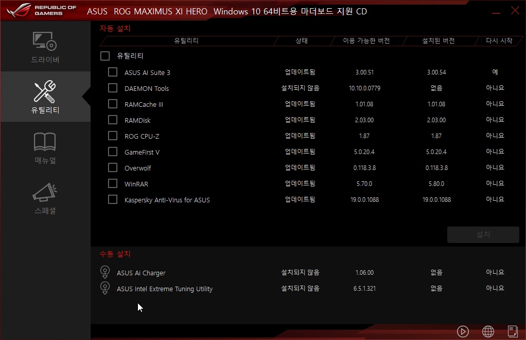 ▲ 또한, 유틸리티 CD 없이도, Armoury Crate 소프트웨어를 통해, 좀 더 쾌적한 환경에서 제품 관리가 가능합니다. 재밌는 점은, ROG 제품군답게, CPU-Z뿐만 아니라, 해당 프로그램 역시 ROG 스킨을 입힐 수 있습니다. 저는 ASUS의 이런 점이 정말 마음에 듭니다.