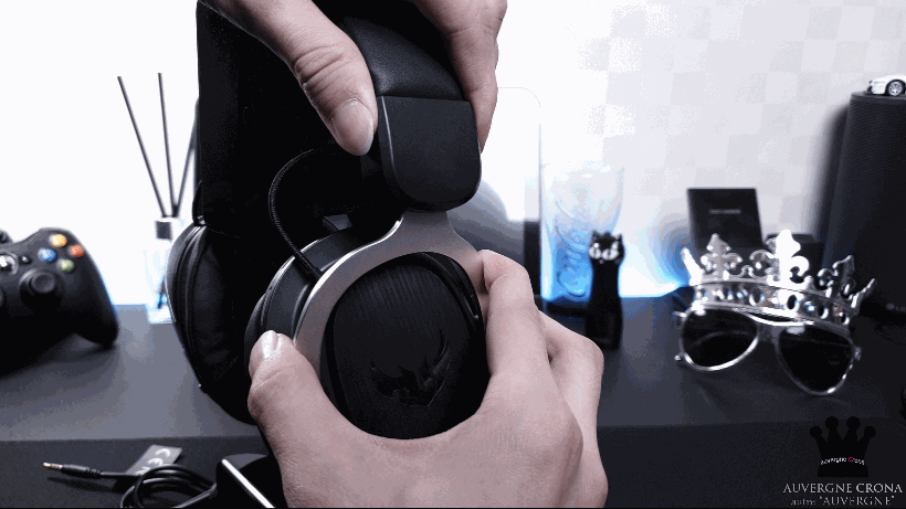 ▲ 헤드셋의 헤어밴드와 연결된 부분은 스테인리스로 제작되었는데, 펄이 들어가 있어, 빛이 반사될 때마다 굉장히 화려하네요. 이어 컵의 외곽에는 TUF 심볼을 음각으로 표현했으며, 헤어라인 가공으로 고급스러움을 더했습니다.