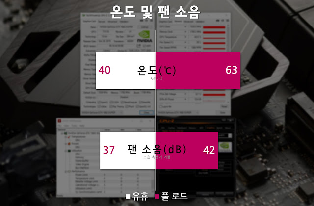▲ 해당 제품은, 제로 팬 기능을 지원하지 않는 제품이기 때문에, 어느 정도 팬 소음을 동반할 것이라 예상했는데요. 기본적으로, 유휴 상태의 그래픽 카드 온도는 약 40도, 풀로드 시에는 63도로 굉장히 착한 온도를 보여줍니다. 유휴 시와 풀 로드시의 팬 속도가 크게는 약 1,000RPM 정도 차이 나는 것에 비해, 소음 정도는 크게 차이가 발생하지 않았는데요. 컴퓨터의 전원이 꺼져있을 때의 환경 소음이 약 33dB 정도로 측정되었는데, 그래픽 카드 바로 옆에서 측정을 진행한 점을 고려해보면, 37dB은 굉장히 정숙한 편입니다. 케이스와 떨어진 환경이라면 더더욱 그렇겠죠. 물론, 풀 로드 시에는 팬이 돌아가고 있음을 확인할 수 있을 정도의 소음은 발생하고요.