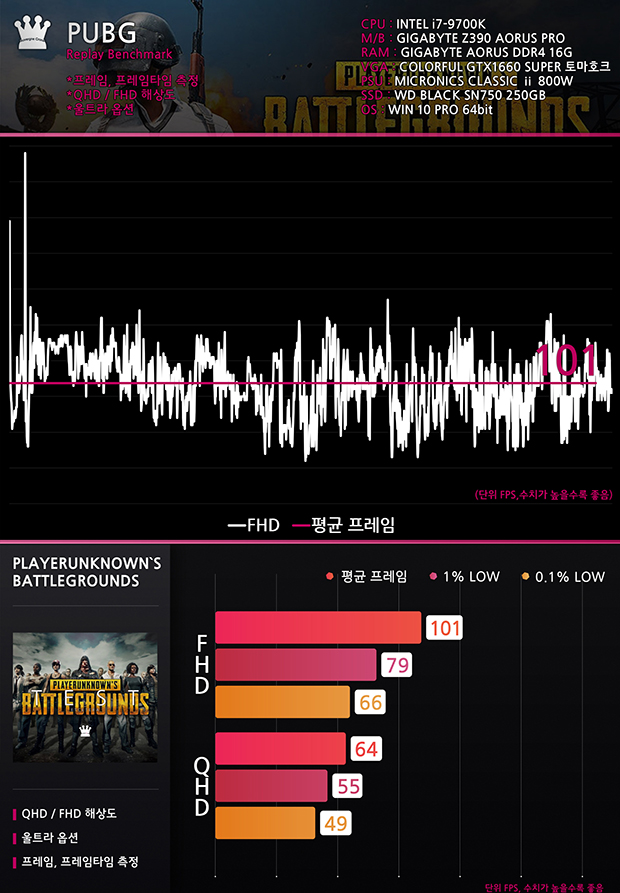 ▲ 울트라 프리셋에서 측정을 진행했는데요. FHD 해상도에서 최대 프레임은 약 180대, 평균 프레임은 101으로, FHD에서 풀옵션 시에도 아주 원활한 플레이가 가능합니다. 또한 QHD 해상도에서도 60프레임 이상을 유지하면서 고해상도에서도 쾌적한 게임 플레이가 가능합니다. 사용자에 따라서 옵션 타협을 한다면, 고주사율에서도 부담 없이 즐길 수 있고요.