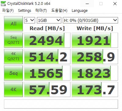 공식스펙인 읽기 2,400MB/s, 쓰기 1,800MB/s 보다 소폭 높게 측정되었습니다.