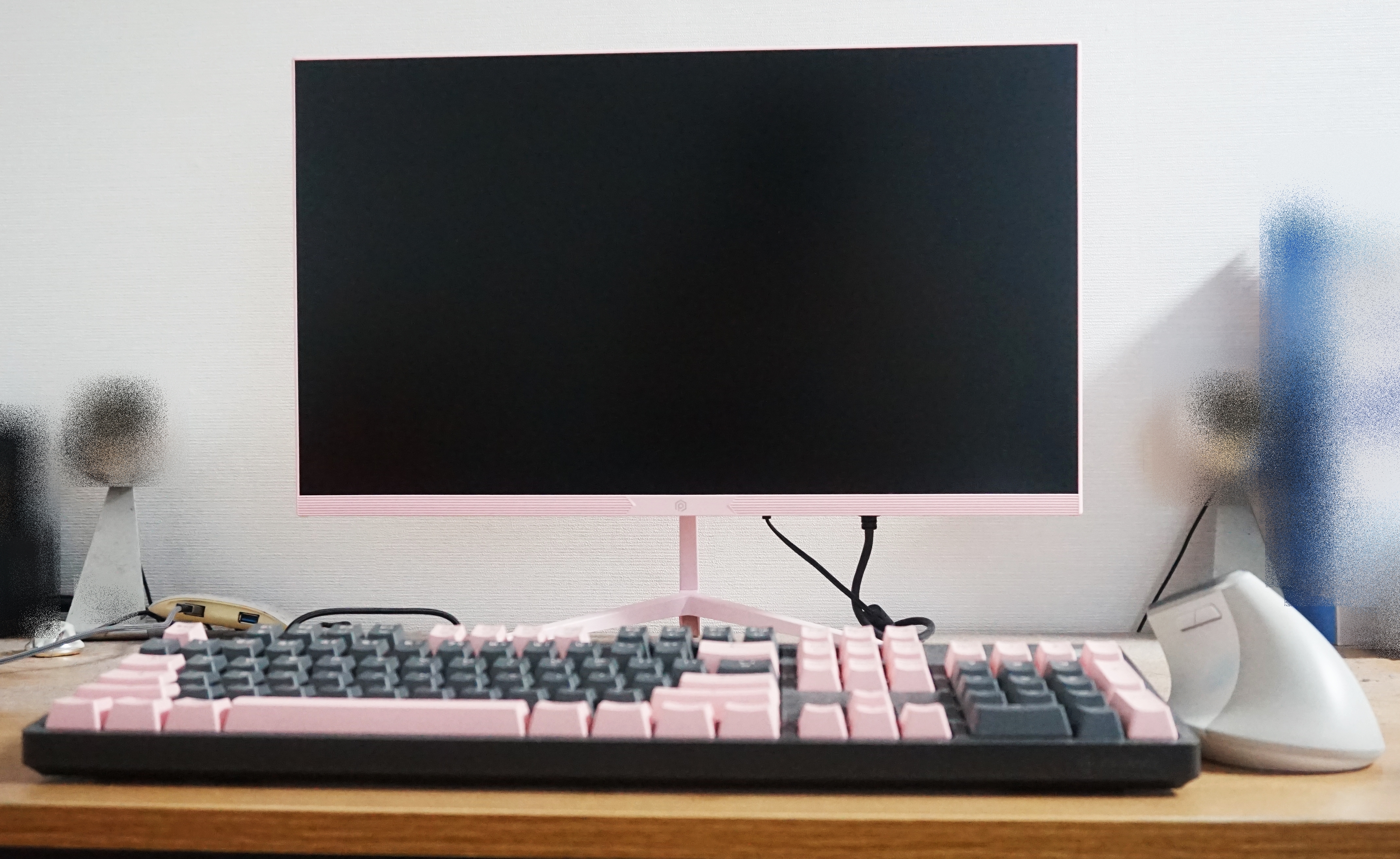 핑크 색상 모니터 하나를 데스크에 놓았을 뿐인데 전체적인 분위기가 화사해지고 필자의 기분도 핑크 핑크 해졌습니다.