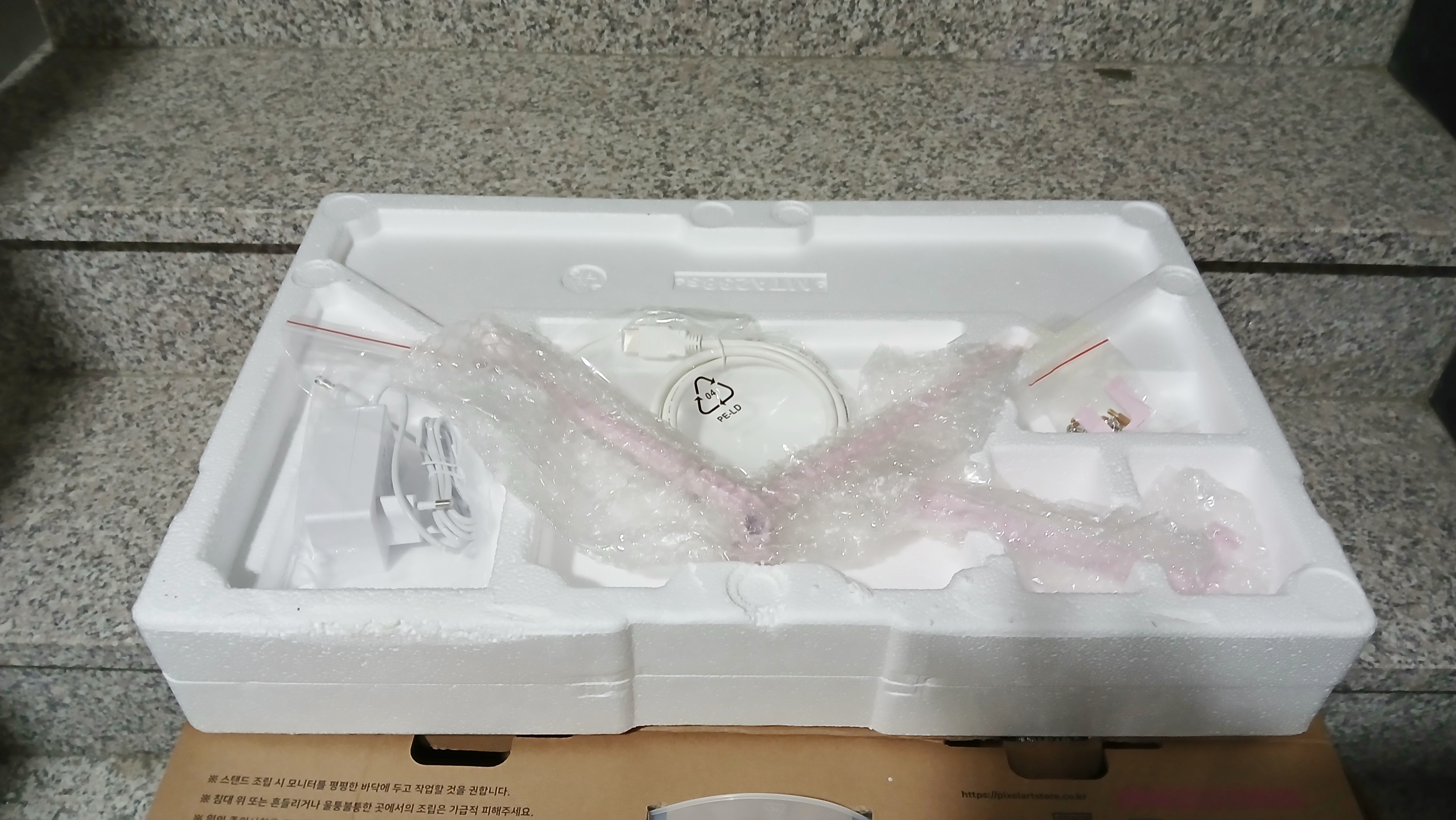 튼튼한 골판지 박스에 모니터와 부속품이 딱 맞게 들어가게 만들어진 스티로폼이 있습니다.