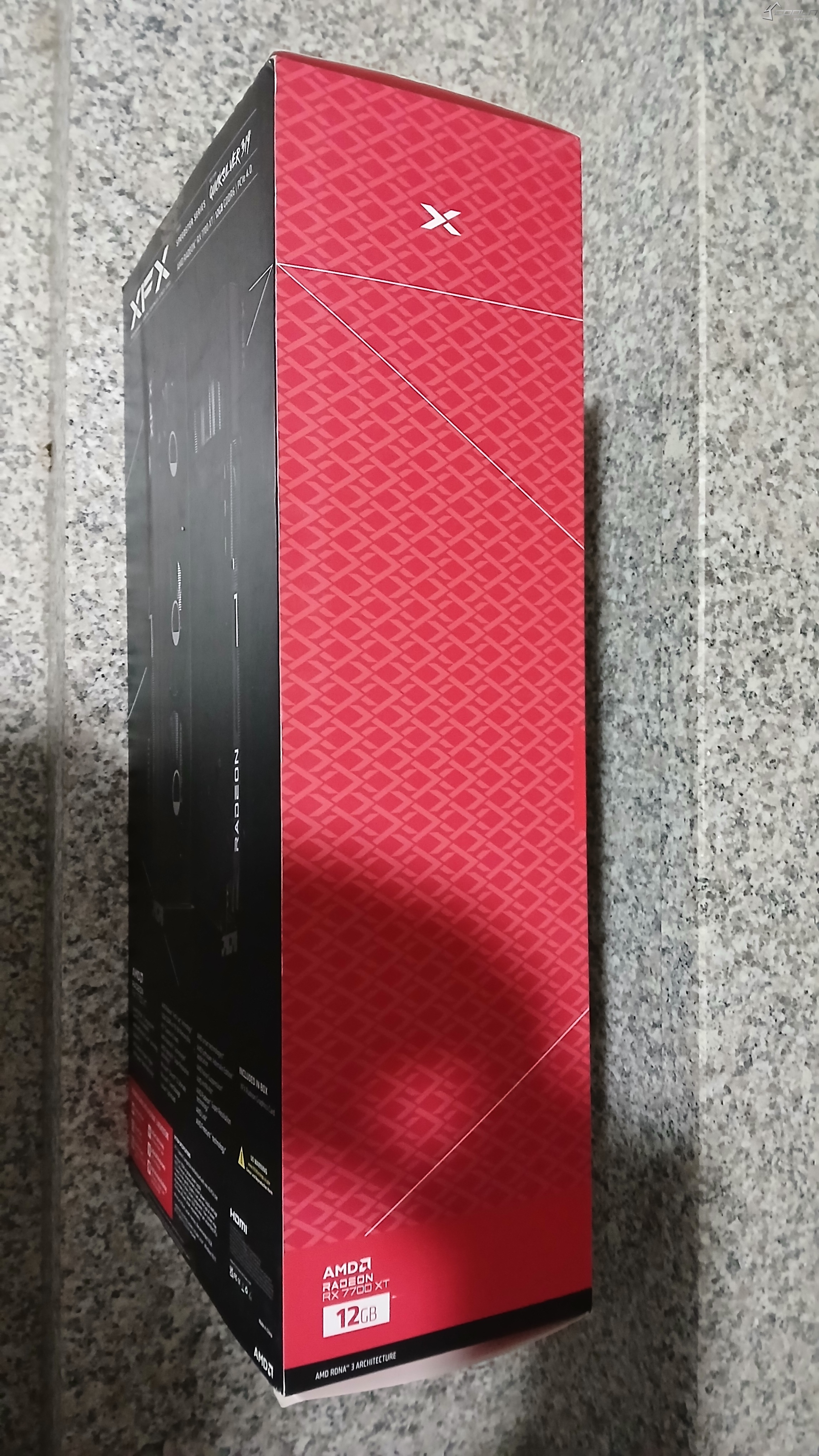 'XFX 라데온 RX 7700 XT QICK 319 BLACK D6 12GB (쿨엔조이 & STCOM 제공)' 제품 박스는 독특하게 세로로 디자인되어 있습니다.