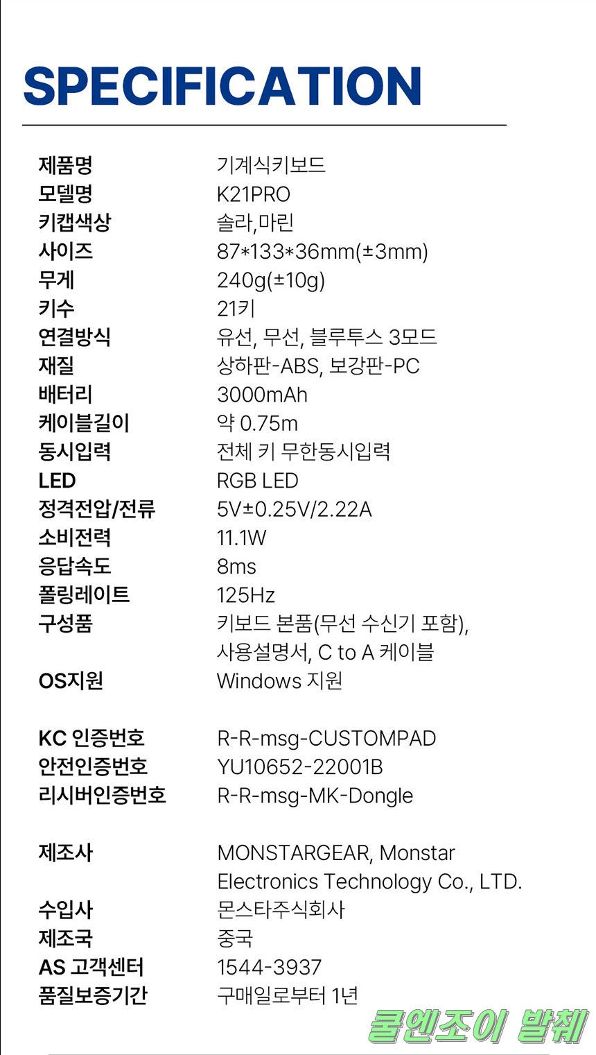 '몬스타기어 가츠 K21 프로 넘버패드 키패드' 의 기본 스펙표를 보면 키수 빼고는 퀄리티 좋은 기계식 키보드의 스펙표를 보는거 같습니다.