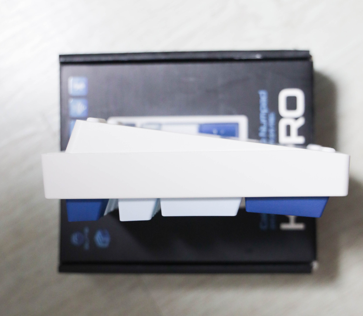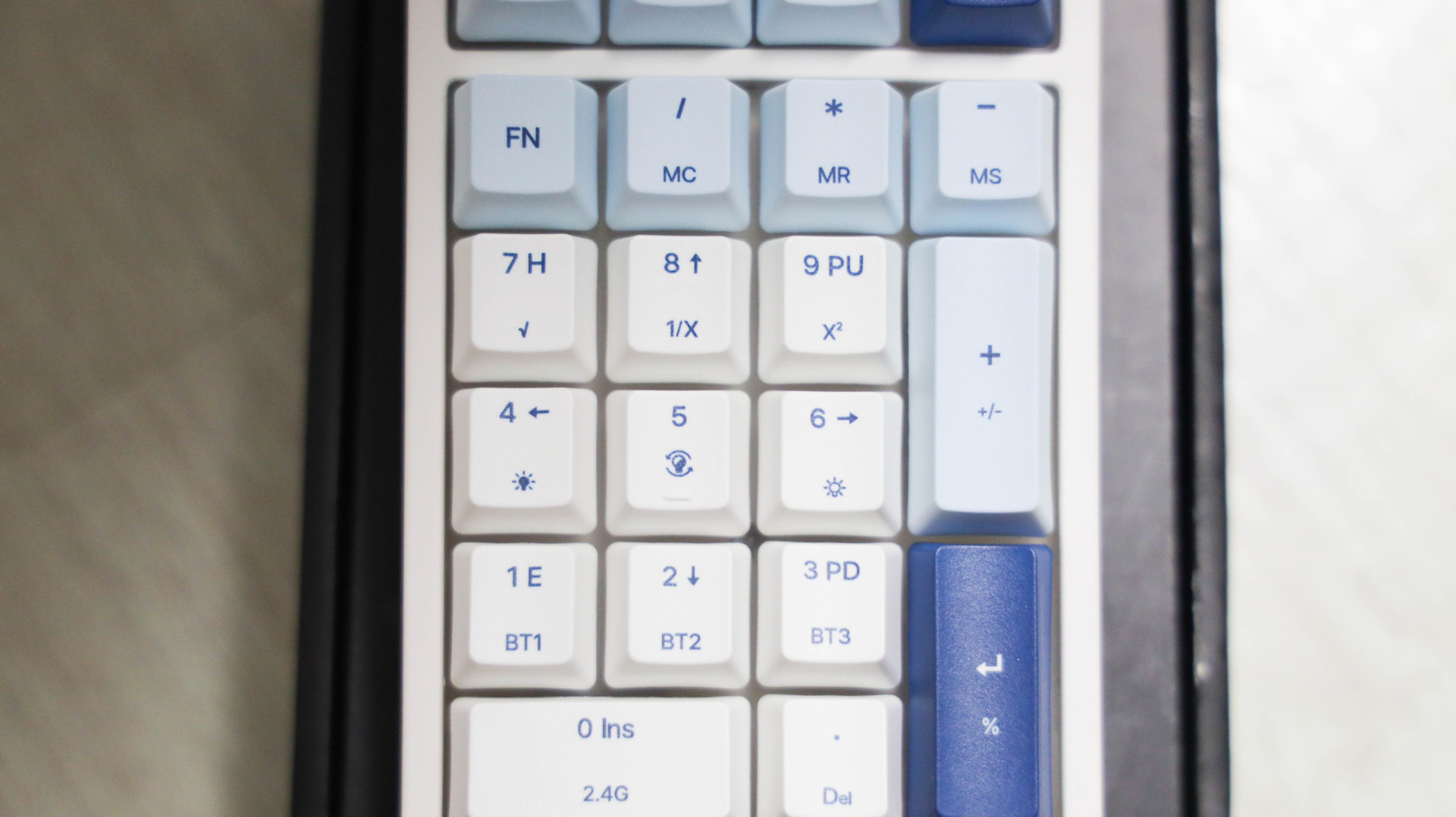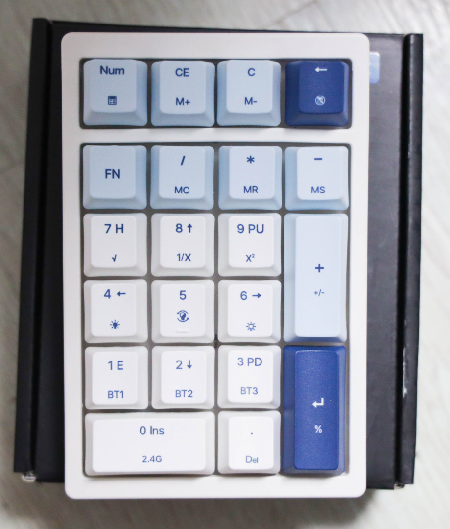 '몬스타기어 가츠 K21 프로 넘버패드 키패드' 의 디자인은 화이트 색상에 솔라, 마린으로 불리는 파란색 계통의 키캡 2종이 장착되어 있습니다.