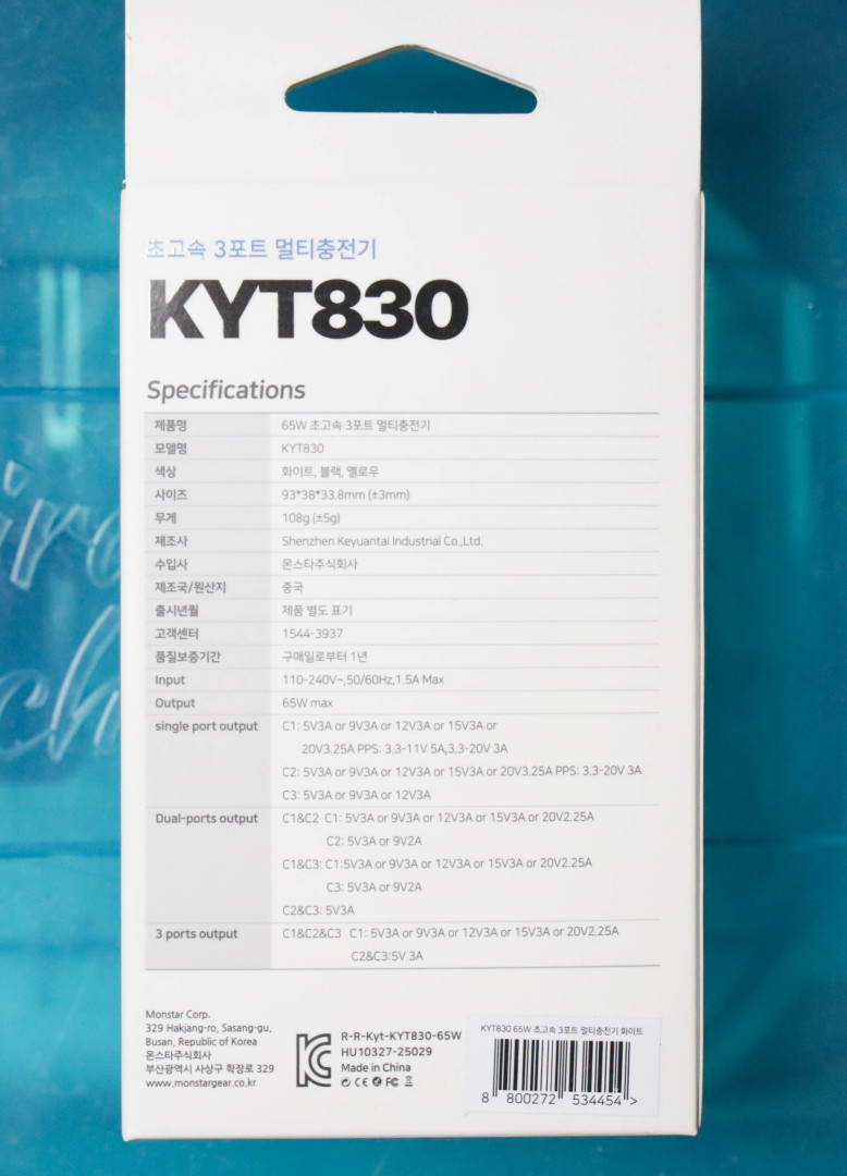 2. 몬스타 기어 KYT830 65W GaN 3포트 초고속 멀티 충전기 제품 박스